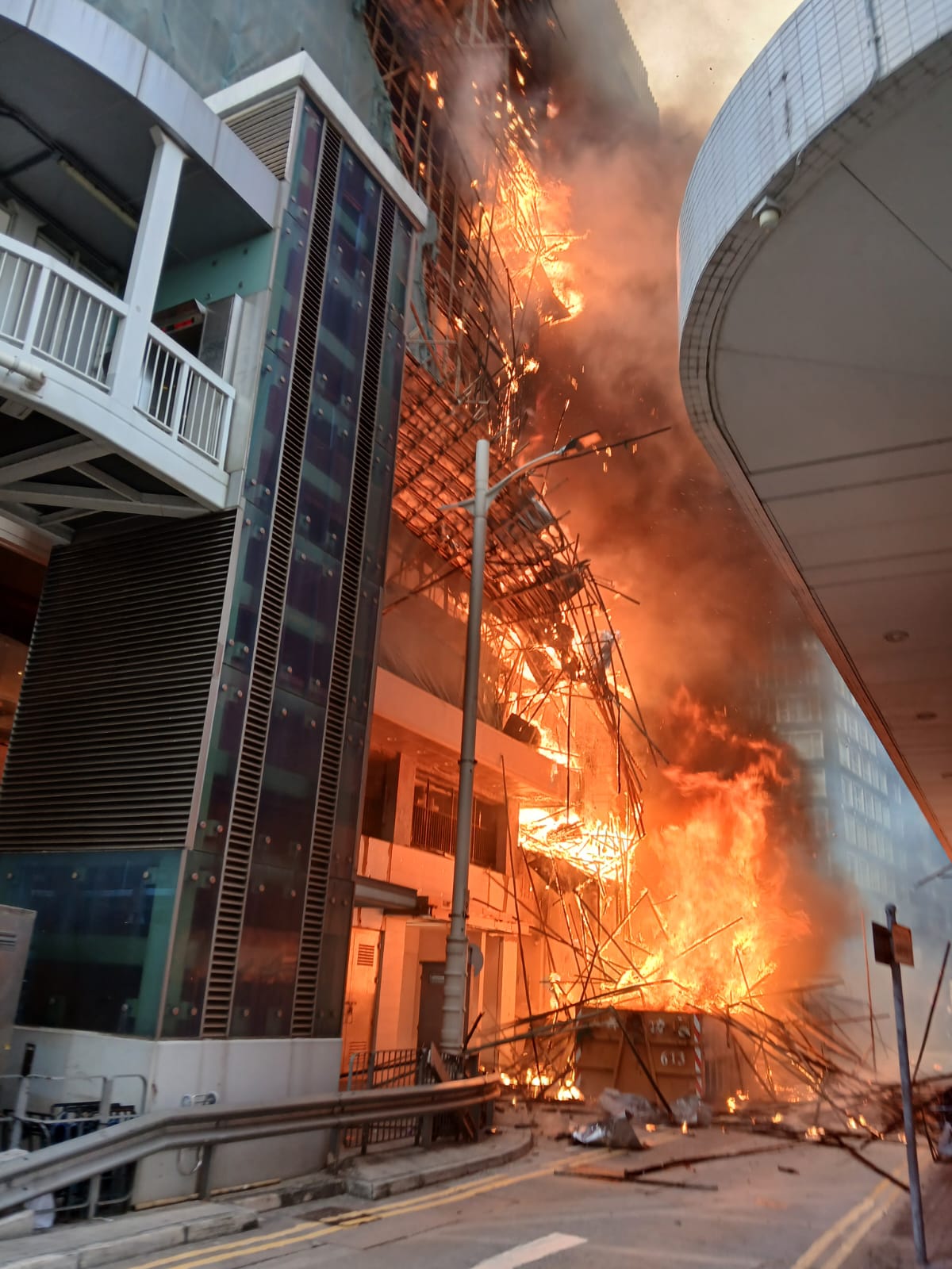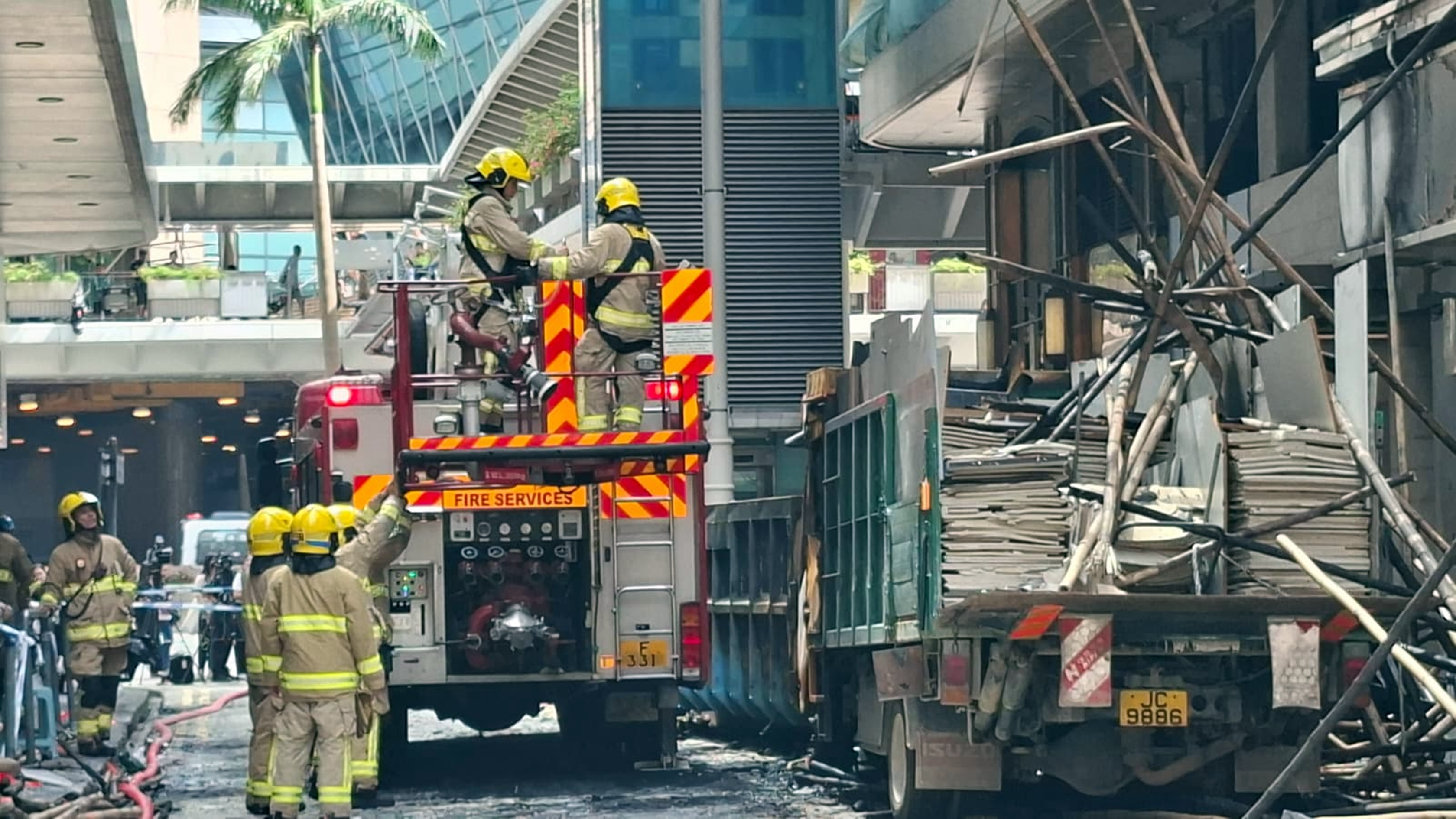 火警現場為中環干諾道中34至37號華懋大廈,上址外牆搭有棚架正進行維修工程。昨日下午4時24分,上址外牆棚架發生火警,火乘風勢迅速蔓延,消防接報後4分鐘到場,惟現場多層棚架已整幅陷入火海,冒起大量濃煙,火屑亦影響到隔鄰大廈,地面一輛貨車和一個環保鬥亦被波及,所幸大廈內部未受嚴重影響。