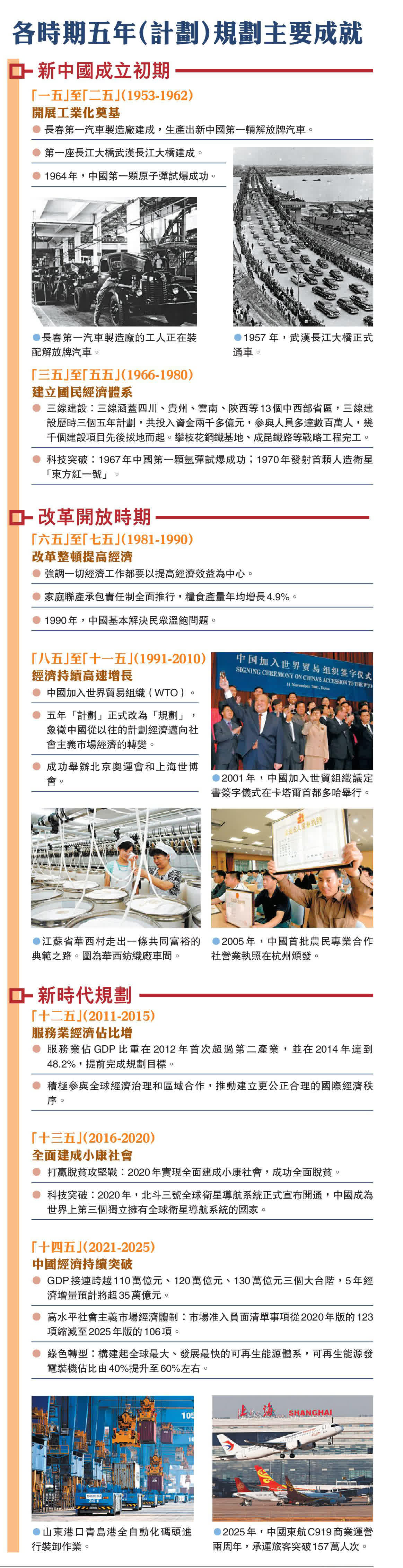 梳理過去數次五年規劃,庫恩提到,新中國成立初期,五年規劃借鑒前蘇聯計劃經濟模式,雖「經歷曲折」,但推動了汽車、鋼鐵等重工業起步。「六五」時期到「九五」時期,促進了從計劃經濟向社會主義市場經濟的轉型,直到「十一五」時期正式將「計劃」改為「規劃」。「十三五」規劃(2016-2020)則落實了習近平「創新、協調、綠色、開放、共享」的新發展理念,實現第一個百年目標,即全面建成小康社會。該規劃首次將「創新」列為首要優先級,並將「生態文明」提升至國家戰略高度。