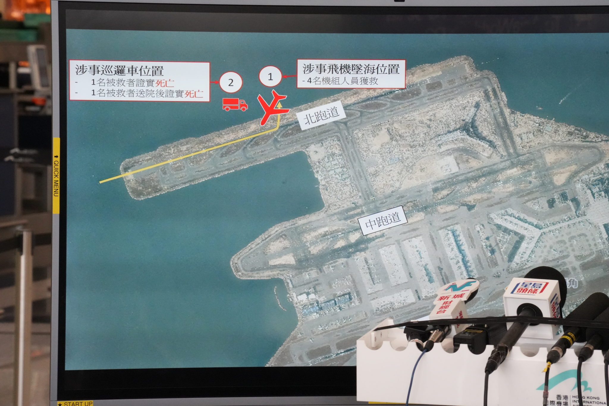 香港機場管理局機場運行執行總監姚兆聰表示,今早凌晨3時53分,一架迪拜來港貨機,在降落機場北跑道時滑出跑道,繼而撞破鐵絲網並墜入海中,事發時,有一輛機場保安公司巡邏車被該飛機撞落海中。事發後,機管局即時啟動機場應變中心,消防人員迅速趕抵現場,將機上4名機組人員救出。