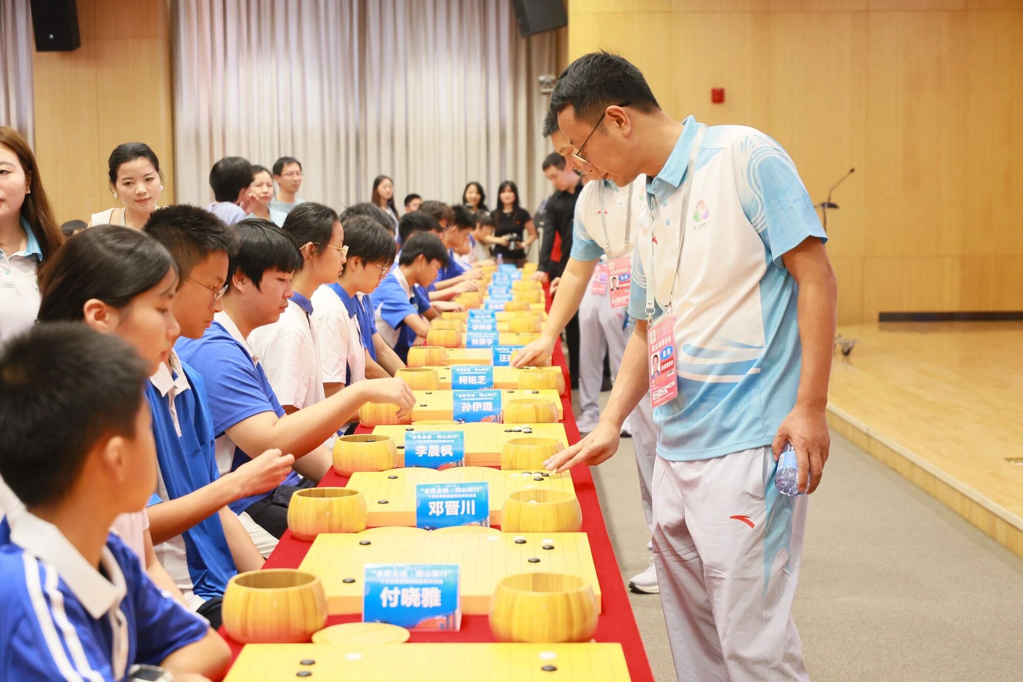 4VS20車輪戰是活動的高潮。報告廳內,20張棋桌呈扇形排開,深中學子正襟危坐,眼神中既有緊張,更有期待。四位職業棋手步履從容,依次走到每一位同學面前,拈子、落子,動作行雲流水。棋枰之上,黑白棋子漸次鋪陳,無聲的較量悄然展開。