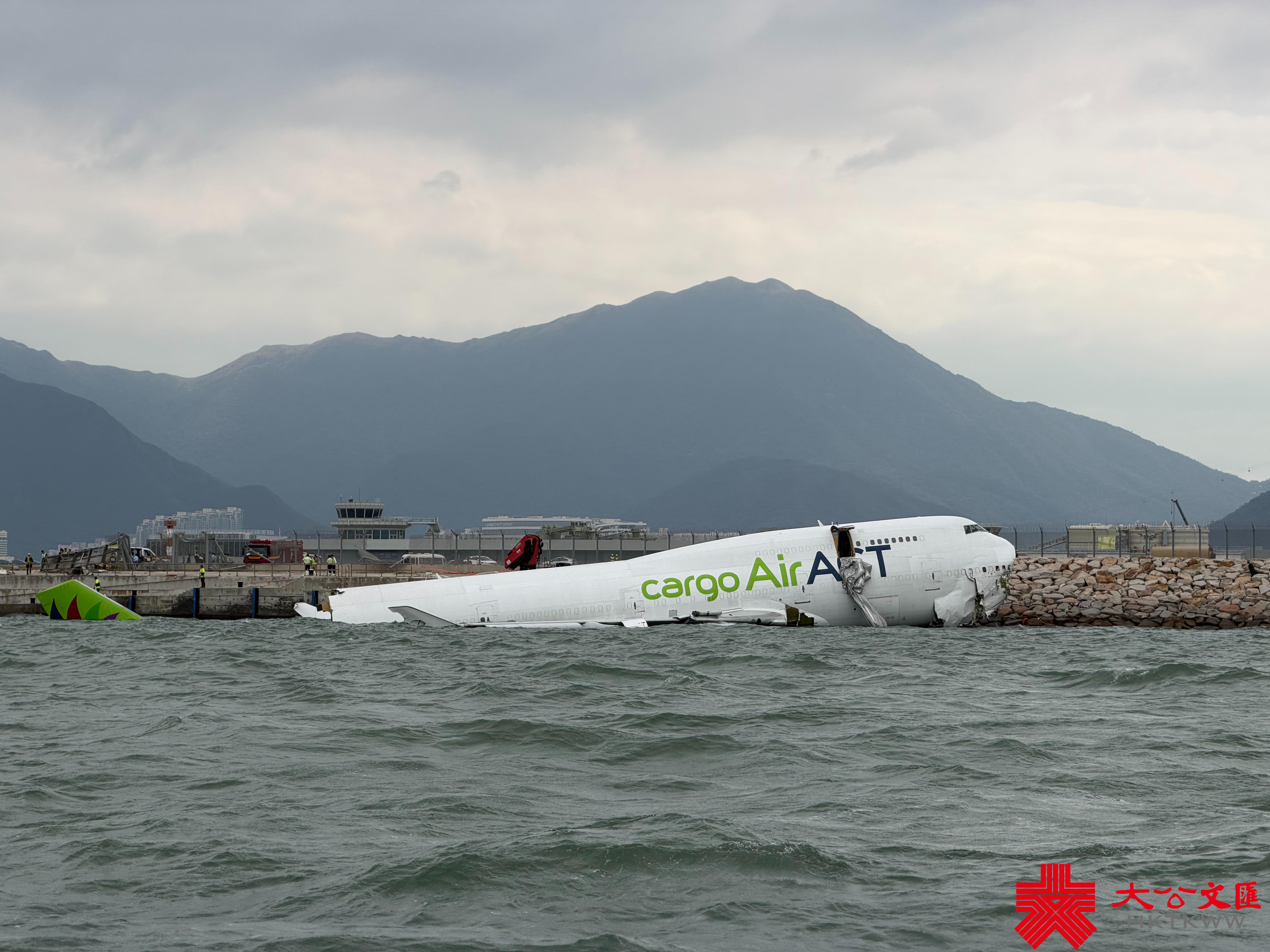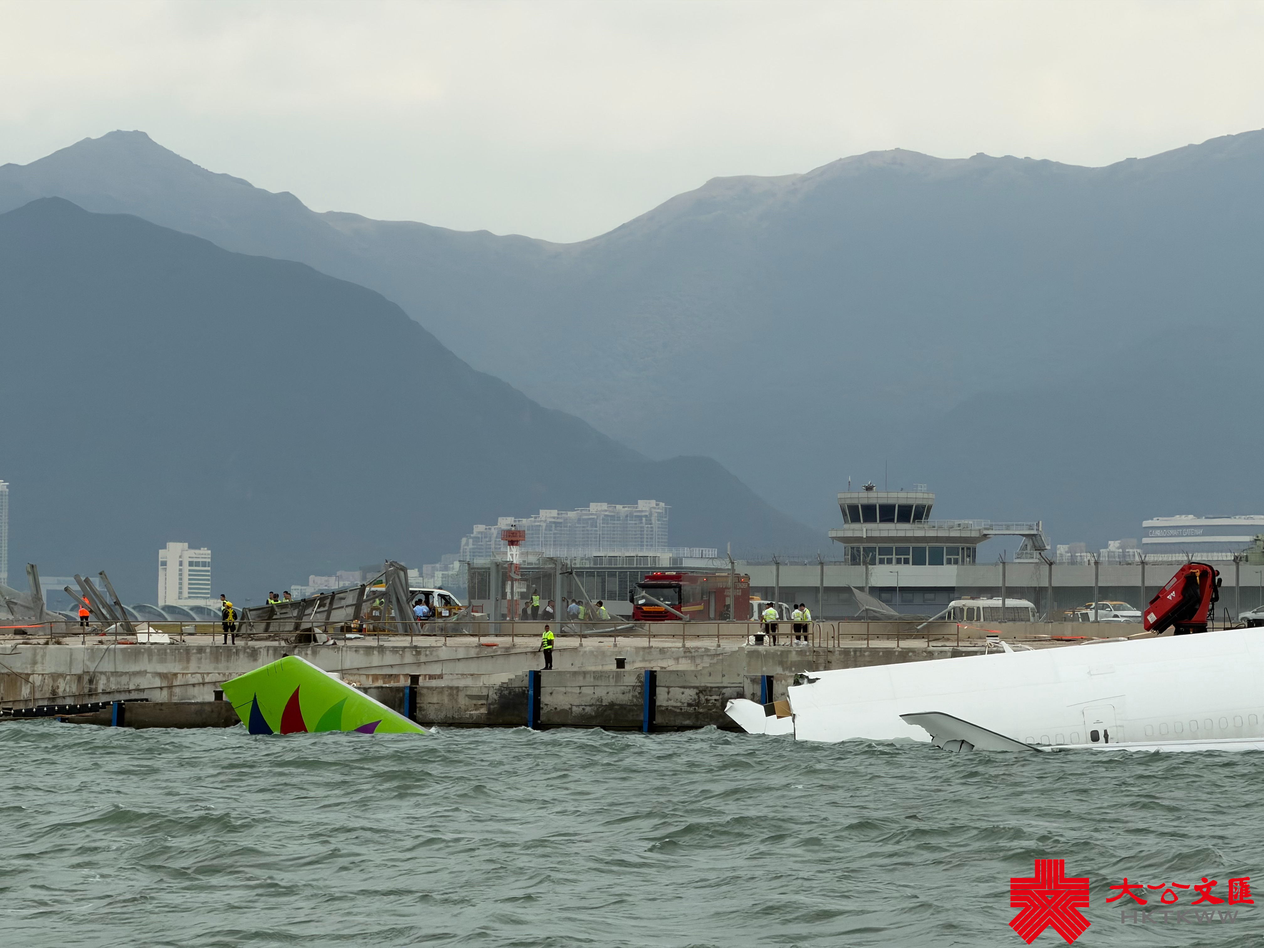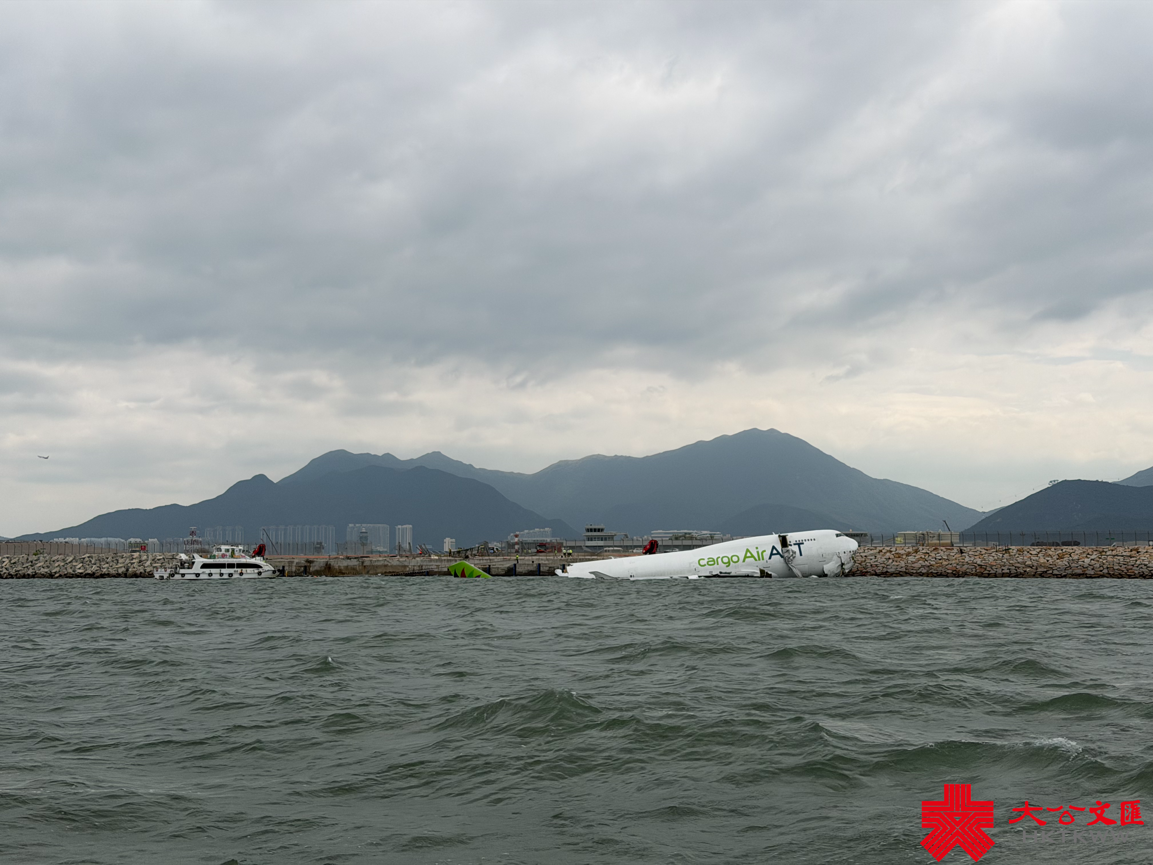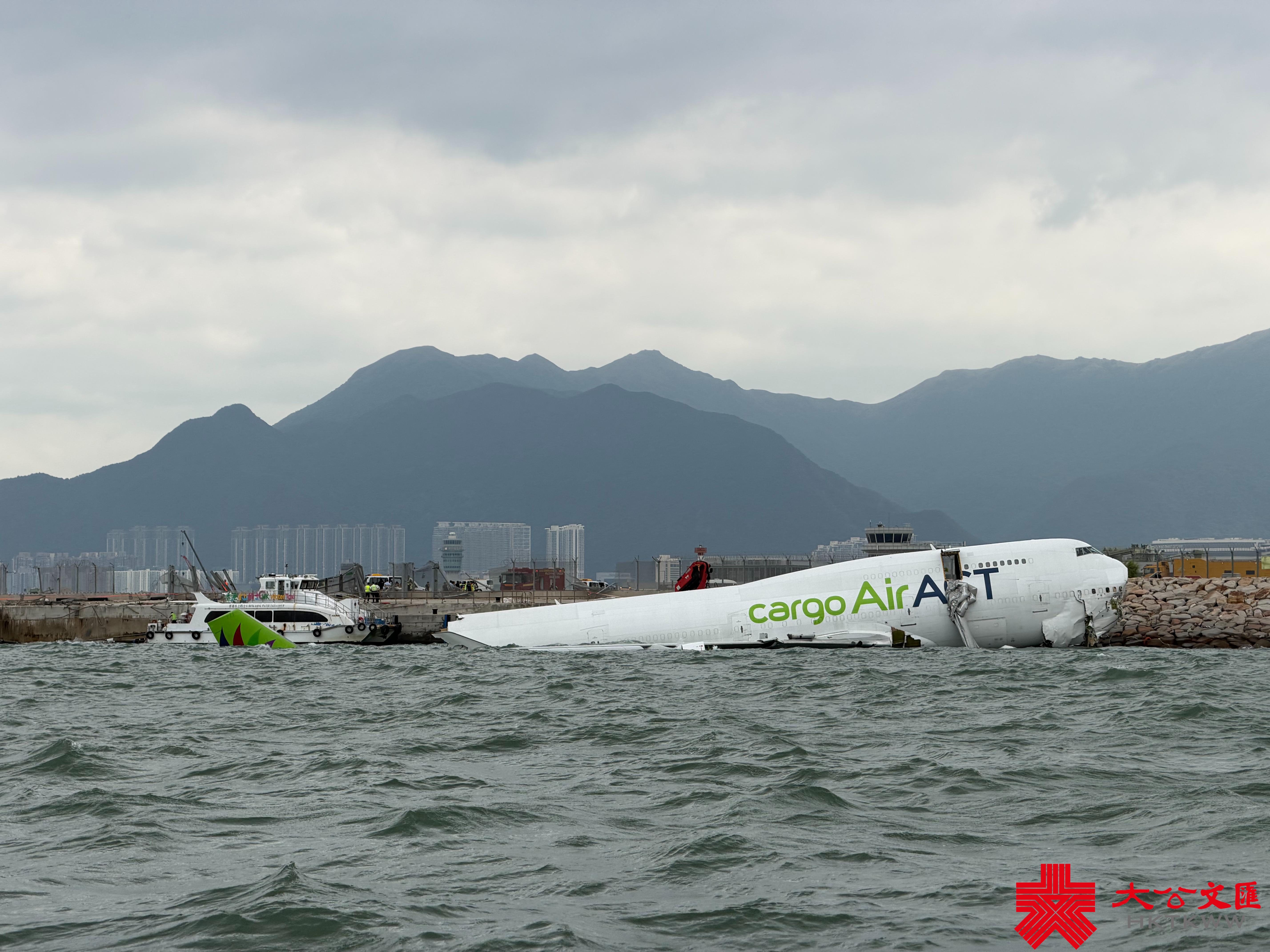 大公文匯全媒體報道,香港國際機場今日(20日)凌晨發生奪命航空事故,一架杜拜抵港貨機衝出跑道,兩名地勤人員連人帶車被貨機撞落海,最終不治。事故發生數個小時後,大公文匯全媒體記者在現場附近發現,涉事貨機仍擱淺在岸邊,附近有機場人員、警務人員戒備,消防救援船隻及警方船隻亦在附近海域戒備。