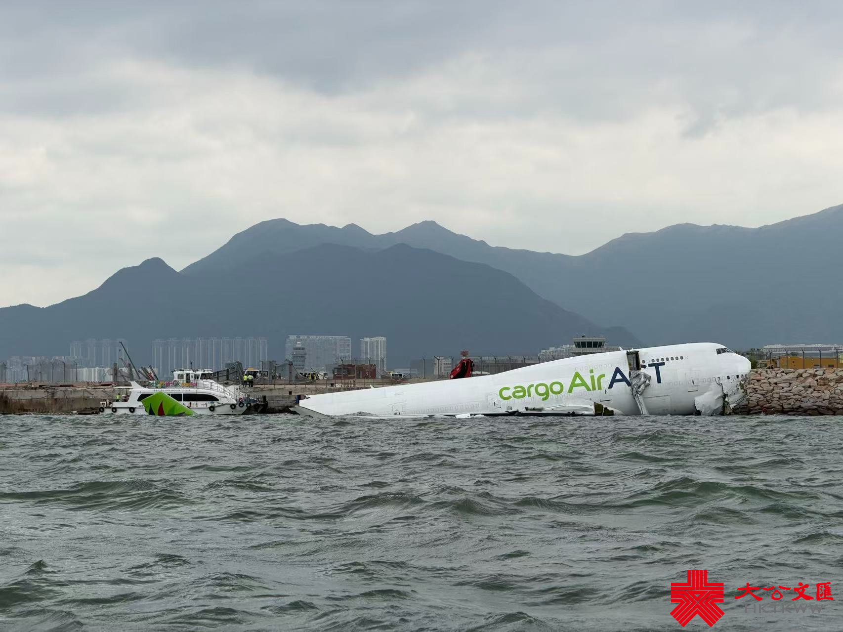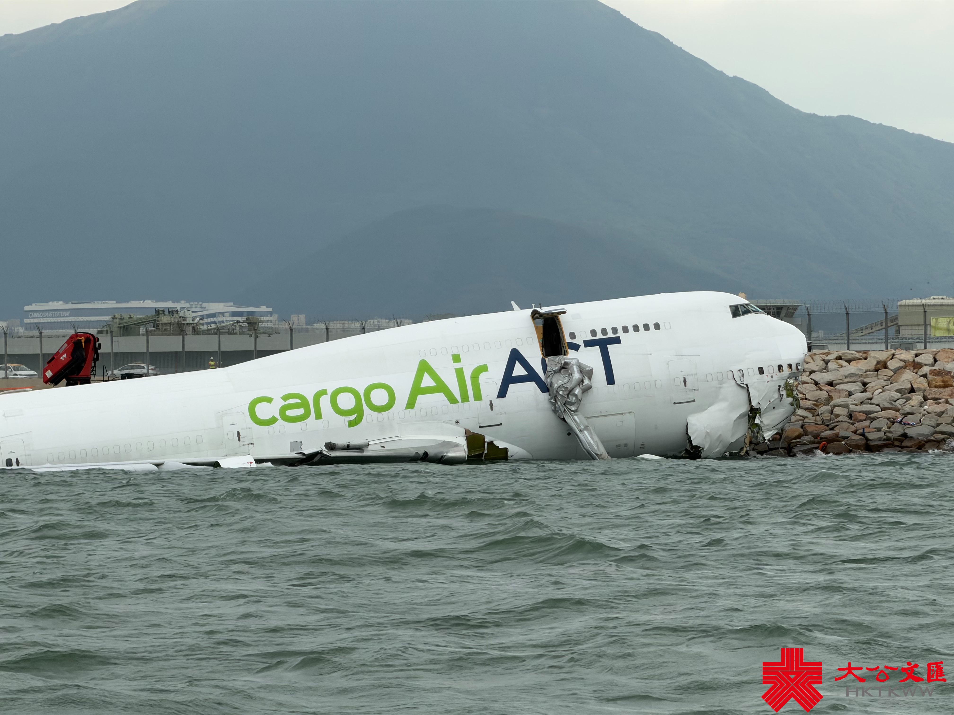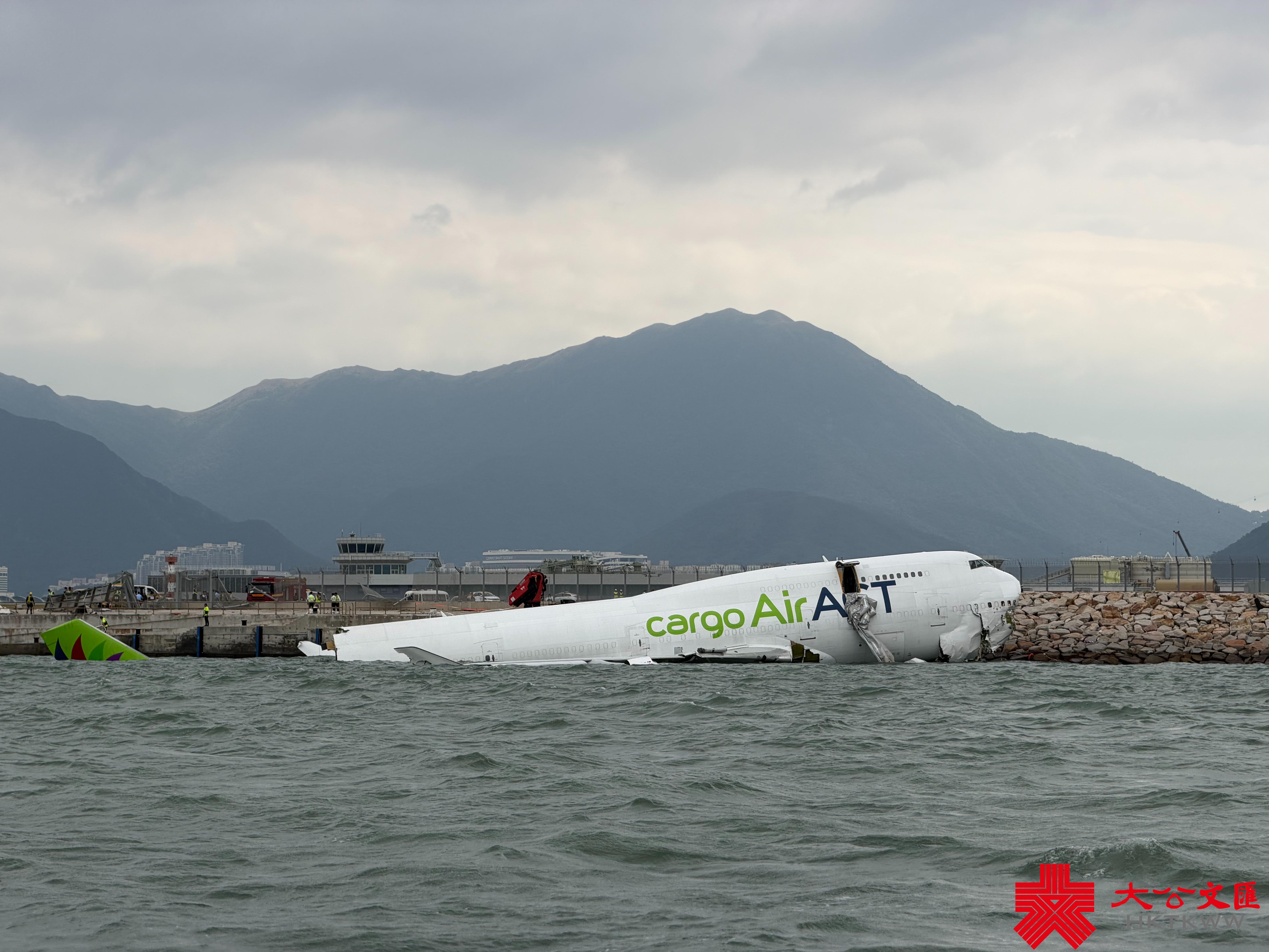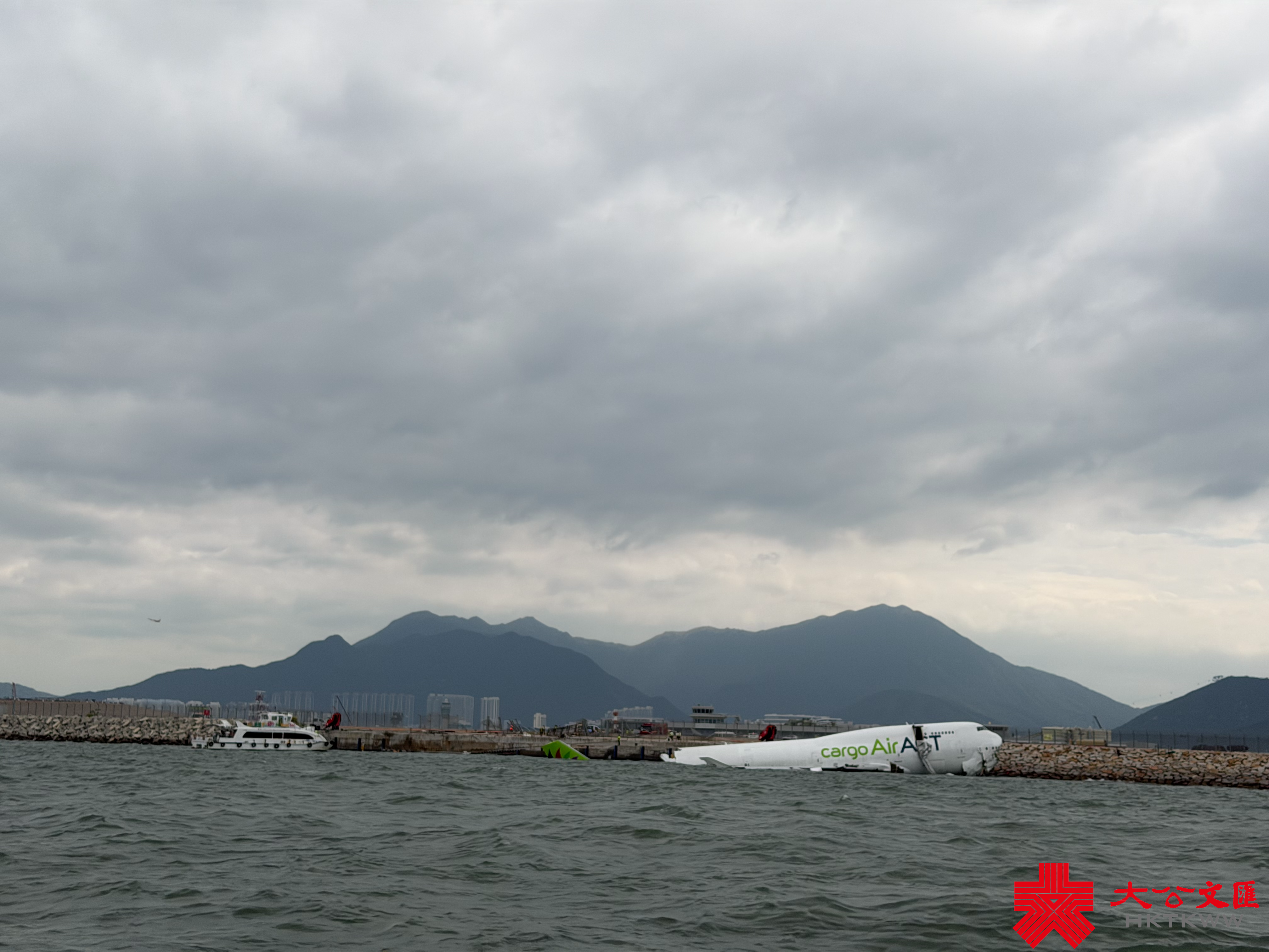 大公文匯全媒體報道,香港國際機場今日(20日)凌晨發生奪命航空事故,一架杜拜抵港貨機衝出跑道,兩名地勤人員連人帶車被貨機撞落海,最終不治。事故發生數個小時後,大公文匯全媒體記者在現場附近發現,涉事貨機仍擱淺在岸邊,附近有機場人員、警務人員戒備,消防救援船隻及警方船隻亦在附近海域戒備。