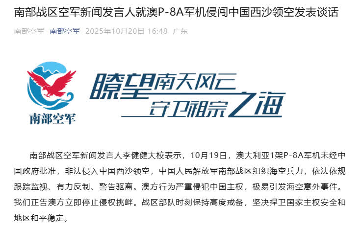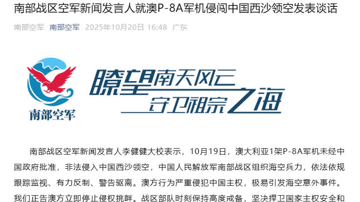 大公文匯網報道,南部戰區空軍新聞發言人李健健大校表示,10月19日,澳大利亞1架P-8A軍機未經中國政府批准,非法侵入中國西沙領空,中國人民解放軍南部戰區組織海空兵力,依法依規跟蹤監視、有力反制、警告驅離。澳方行為嚴重侵犯中國主權,極易引發海空意外事件。我們正告澳方立即停止侵權挑釁。戰區部隊時刻保持高度戒備,堅決捍衛國家主權安全和地區和平穩定。