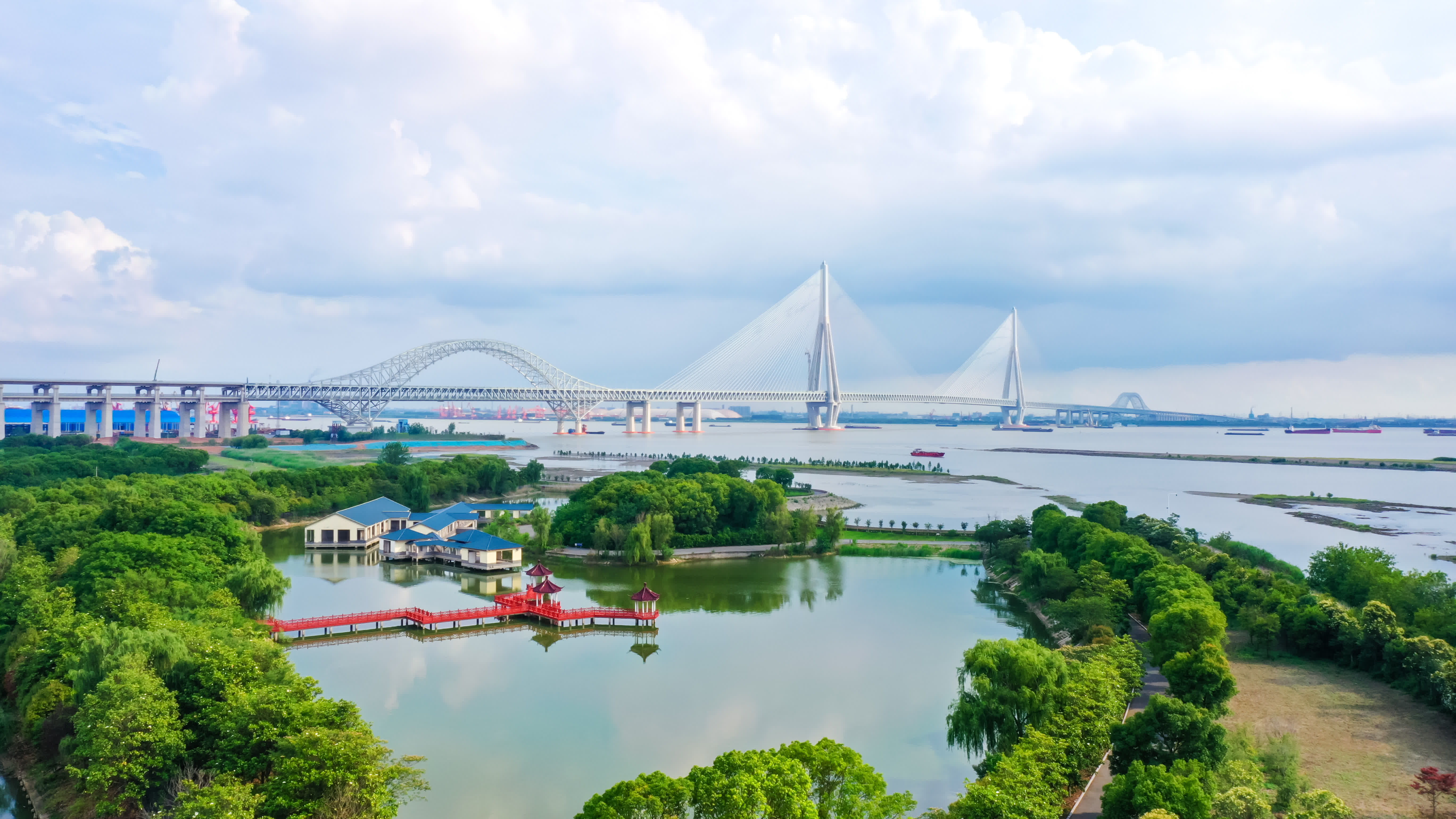 作為目前全球最大規模多功能荷載非對稱佈置橋樑,常泰長江大橋跨江段全長10.03公里,由一座主跨1208米鋼桁樑斜拉橋、兩座主跨388米鋼桁拱橋和一座連續鋼桁樑橋組成,創下了最大跨度斜拉橋、最大跨度公鐵兩用鋼桁拱橋的世界紀錄,實現了減沖刷減自重台階型沉井基礎、「鋼—混」混合結構空間鑽石型橋塔等4項世界首創設計。