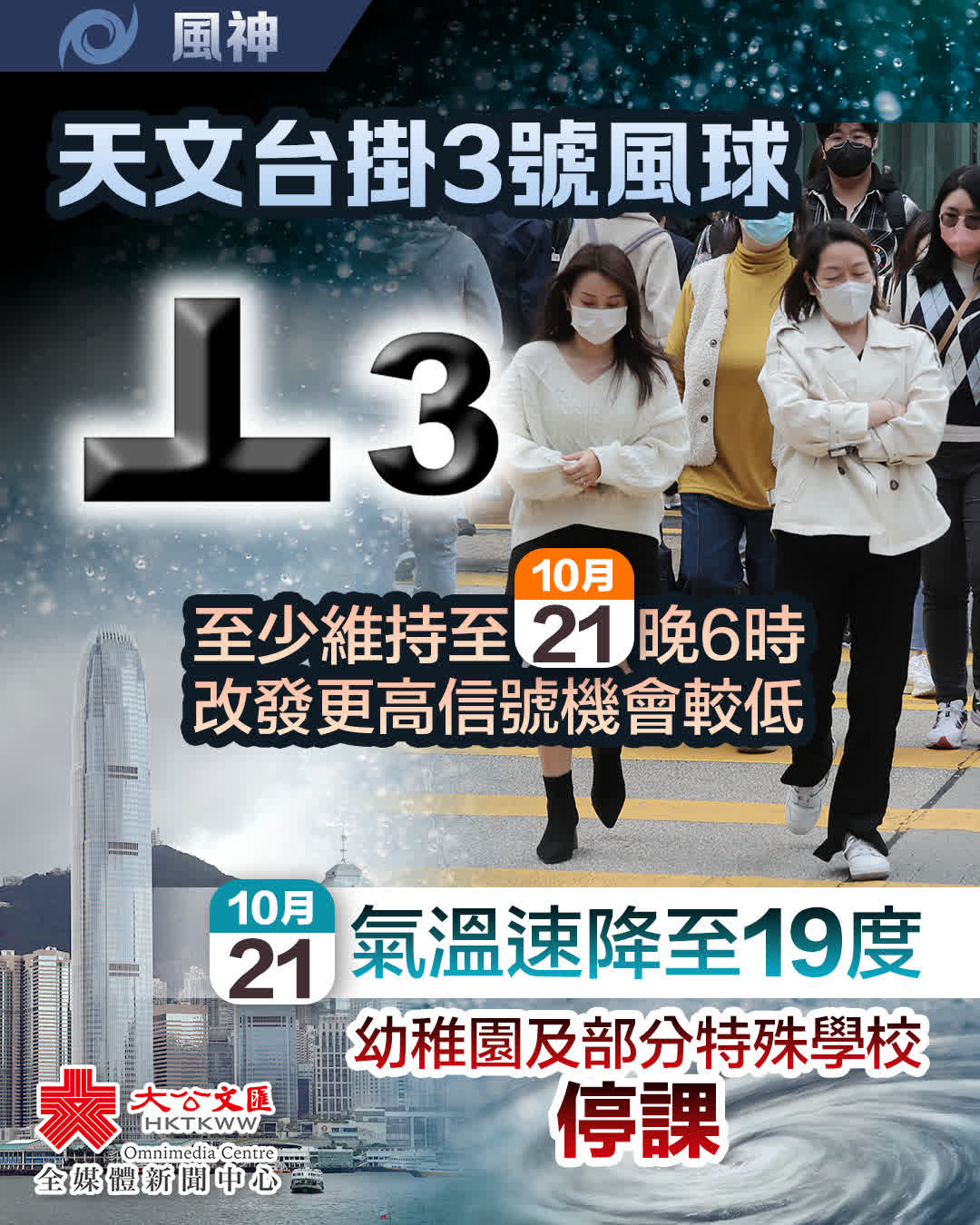 大公文匯全媒體報道,天文台今日(20日)下午5時20分直接發出三號強風信號,取代強烈季候風信號,預料本港平均風速每小時41至62公里。「風神」會在今晚至明早最接近香港,於本港以南約400公里外掠過。除非「風神」採取更為接近珠江口的路徑或顯著增強,否則改發更高熱帶氣旋警告信號的機會較低,三號強風信號將至少維持至明日(21日)下午6時。