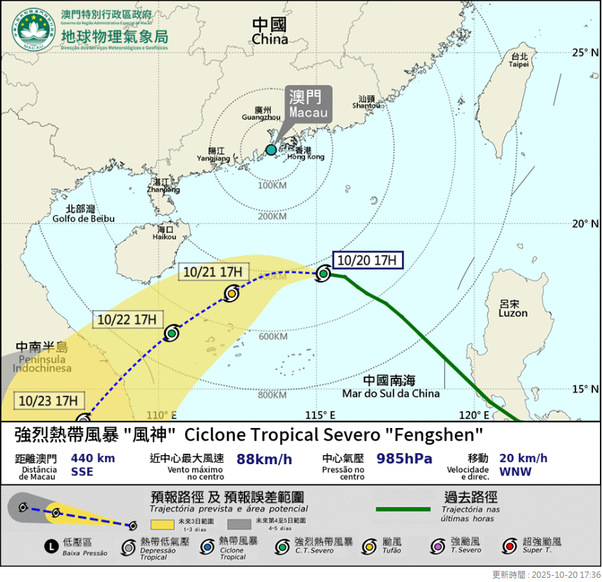 澳門氣象局指,「風神」已增強為強烈熱帶風暴,並進入澳門500公里範圍;受東北季風及「風神」共同影響,預料澳門風力將進一步增強,因此局方將於晚上7時發出三號風球,取代強烈季候風信號。按現時預測路徑,「風神」於明日將進一步增強為颱風,並在澳門以南約400公里掠過,對澳門造成的影響增加,橋上風力短暫可能達8級,因此明日凌晨至清晨改發八號風球的機會為較低至中等。