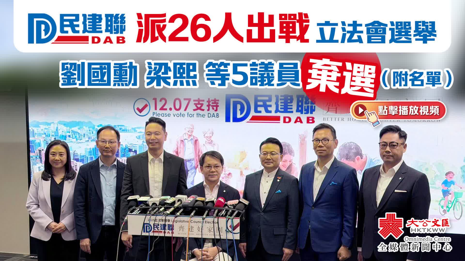 民建聯宣布派出26人出戰立法會選舉,當中包括14名爭取連任的現任議員。其中,13人參加地區直選、5人參加功能界別選舉、8人參加選委界選舉。劉國勳、梁熙、李世榮、郭玲麗、黃英豪5位現屆立法會議員棄選。