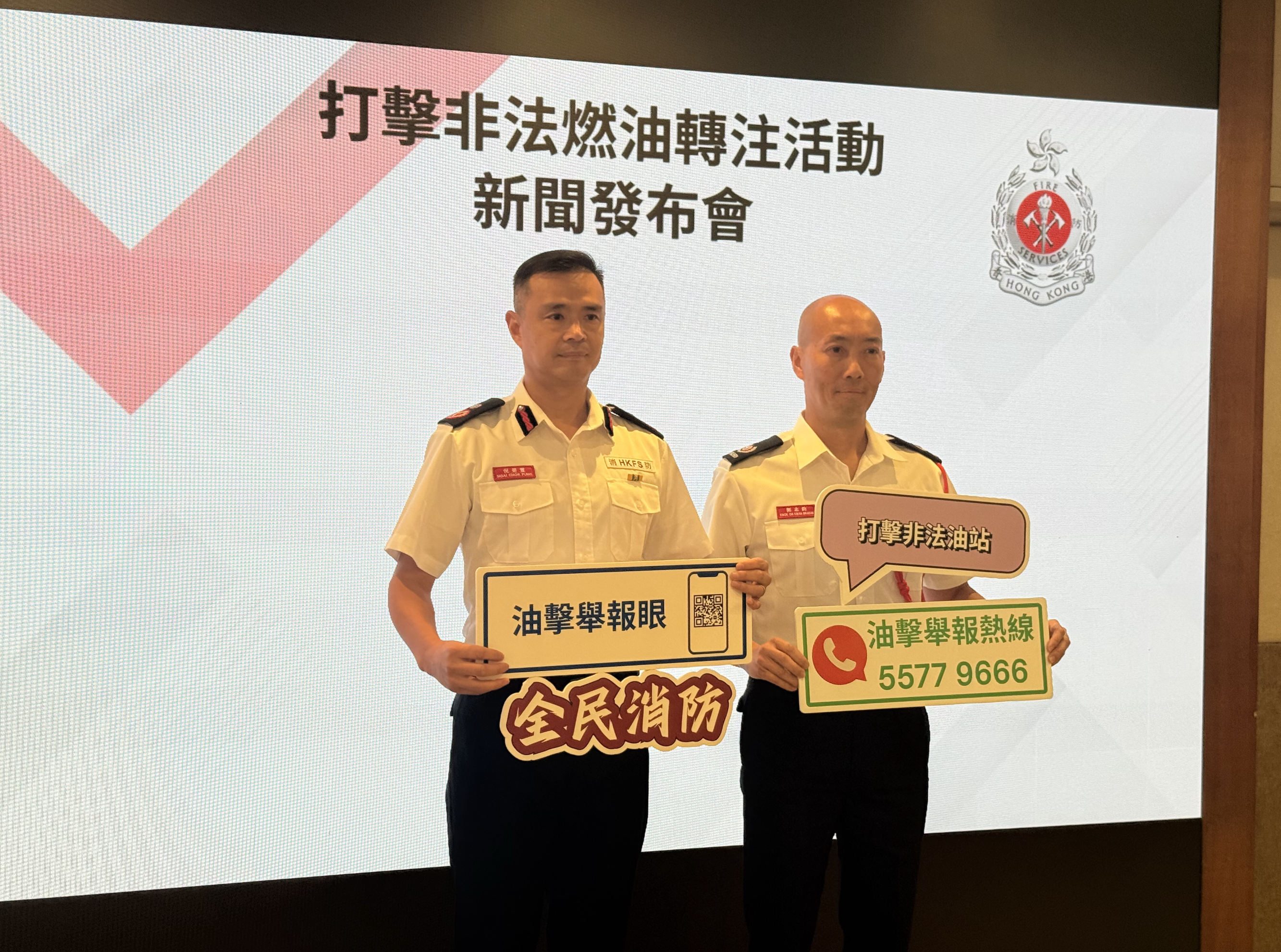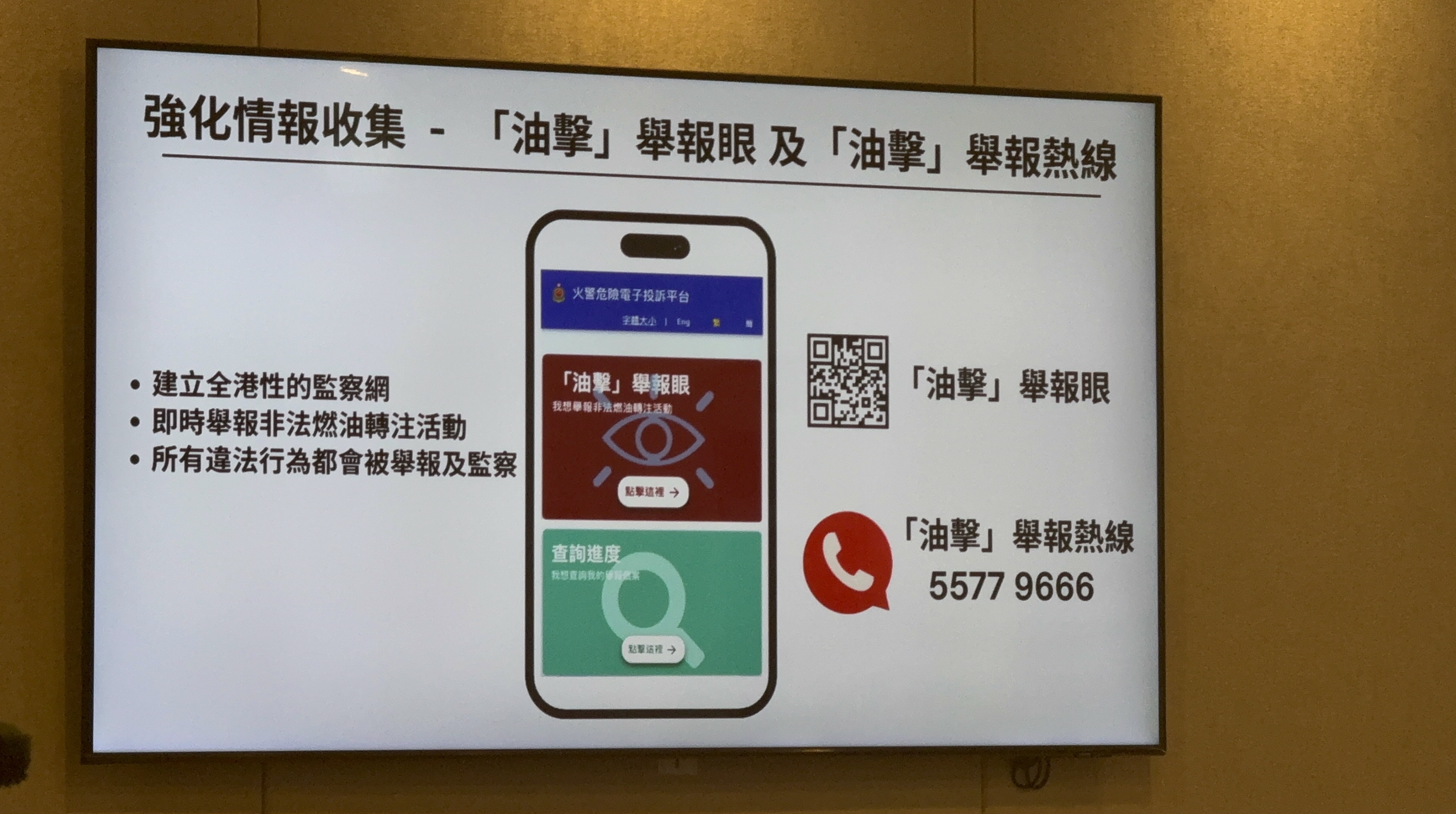 此外,消防處亦成立了「打擊非法燃油轉注活動策略小組」,聯合相關政府部門及業界持份者,加強情報交流與協調聯合行動。倪楚豐指,目前該小組正與各政府部門和業界建立情報收集機制,並研究推出舉報獎金制度,以鼓勵市民舉報非法燃油交易。