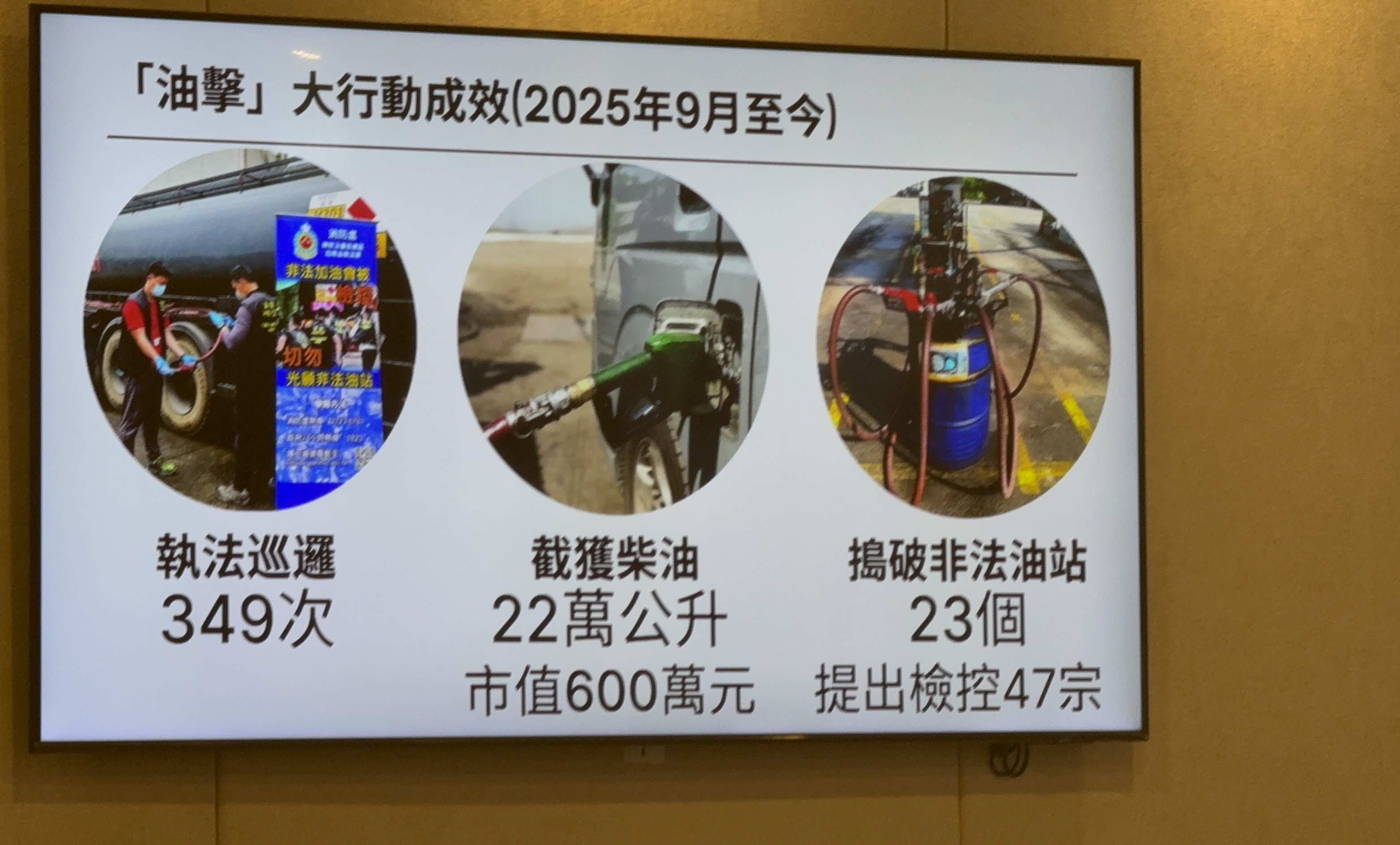 (大公文匯全媒體 記者 周禹含)消防處今日(21日)在消防處總部大廈舉行打擊非法燃油轉注活動新聞發布會。據會上公布的數據,自9月起至今展開的代號「油擊」的全港性執法大行動已進行349次執法巡邏,共截獲22萬公升柴油,市值約600萬元,搗破23個非法油站,並提出檢控47宗。