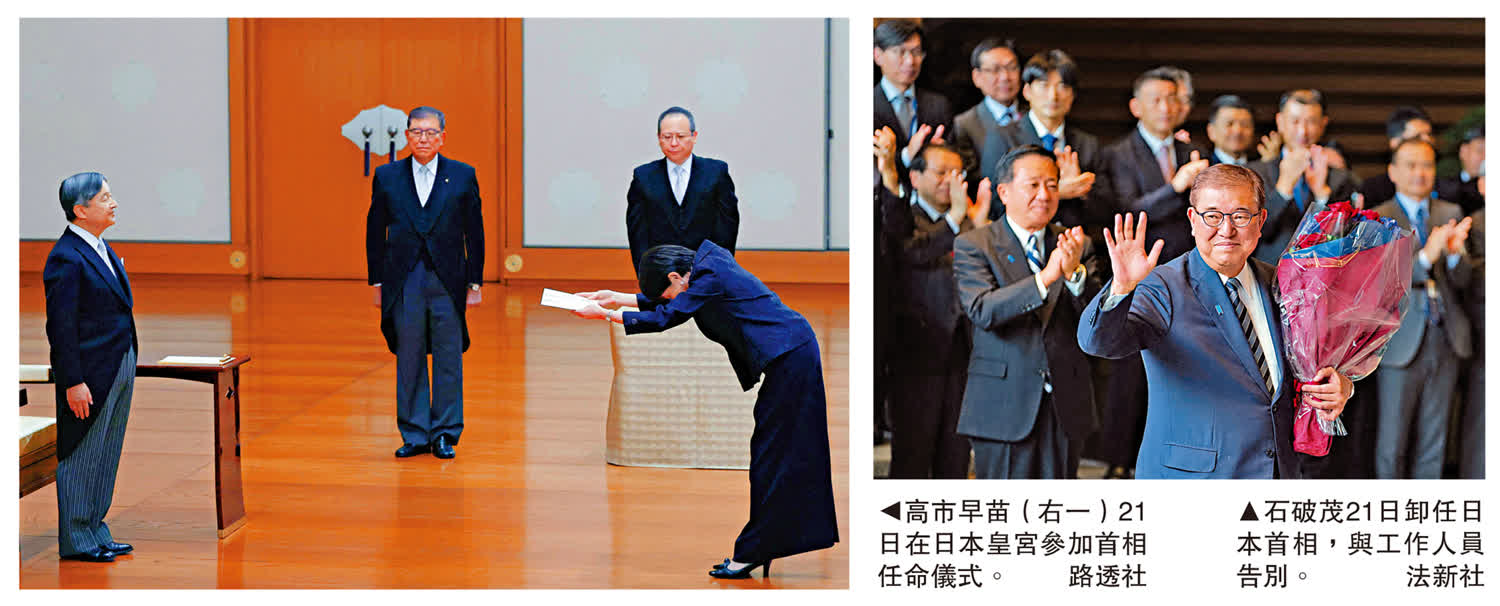 首相指名選舉21日先後在日本國會眾參兩院進行。高市早苗獲得眾議院465張有效選票中的237票,超過議席總數的一半,首輪投票即勝出;但在參議院,高市首輪投票獲得123票,以一票之差未過半,在第二輪才憑藉多數票當選。當晚,高市前往日本皇宮參加首相任命和內閣大臣認證儀式,隨後組建新內閣。日本石破茂內閣已於同日稍早前全體辭職。