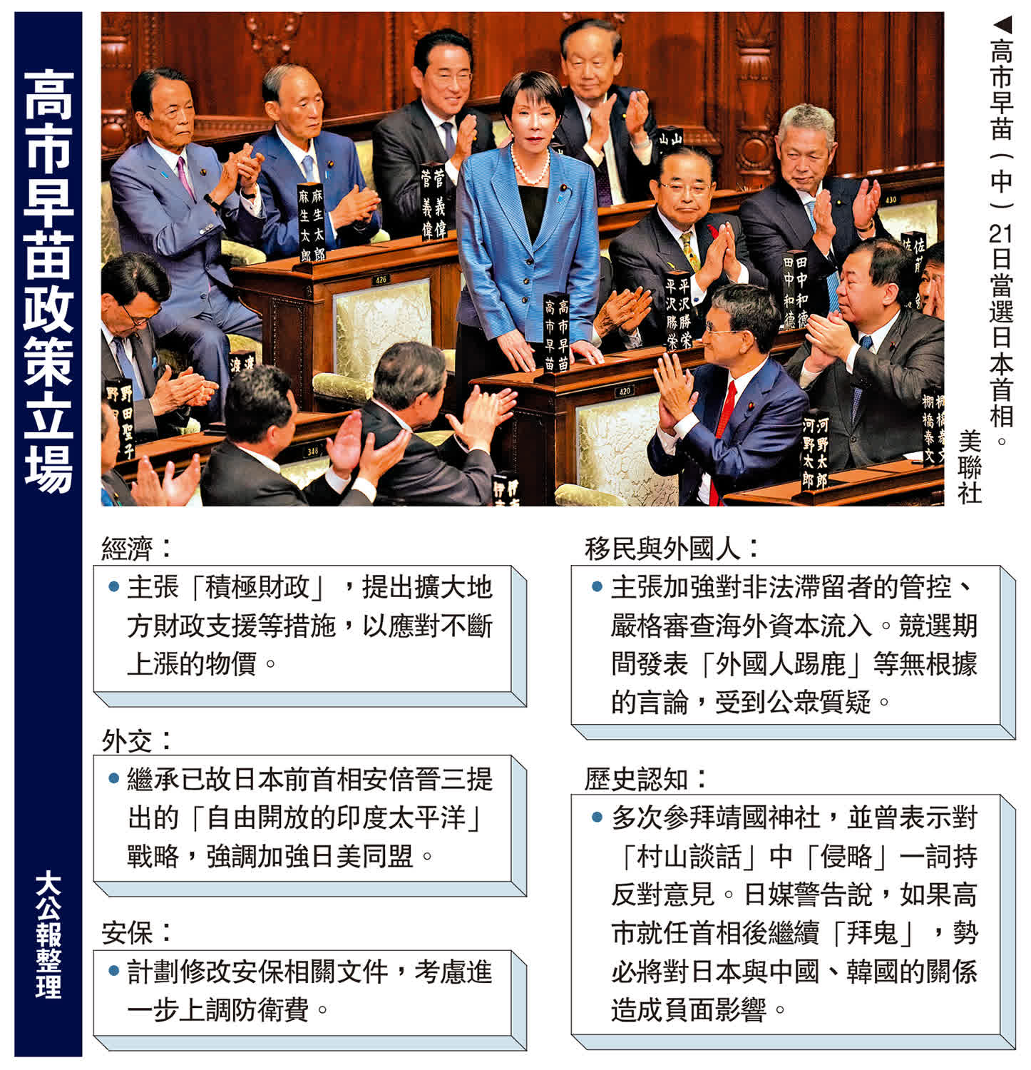 大公報綜合報道,日本自民黨總裁高市早苗21日在國會首相指名選舉中當選日本第104屆首相,也是日本首位女首相。當晚,高市組建新內閣,標誌着由自民黨和日本維新會組成的執政聯盟正式啟動。日媒注意到,新內閣包括自民黨內各派人士,表明高市試圖兼顧黨內派閥平衡。儘管如此,高市仍面臨朝小野大、新執政聯盟不夠穩固等多重挑戰,其右翼立場亦可能影響日本外交政策。