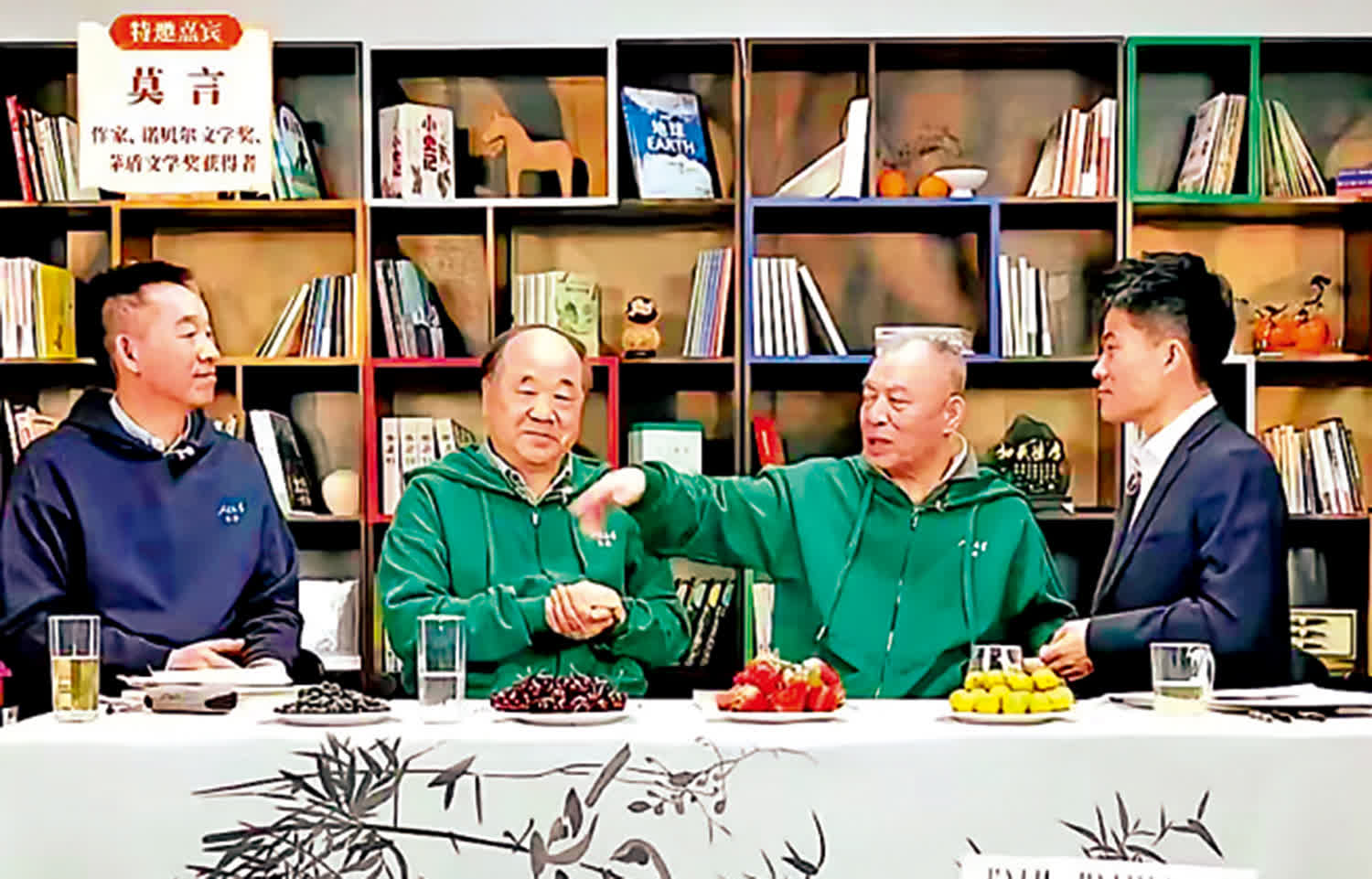 不但不排斥新的傳播方式,莫言還主動參與過幾場直播,為文學作品、刊物「帶貨」。2023年4月23日「世界讀書日」當天,他第一次走進東方甄選直播間,對話俞敏洪與董宇輝,吸引了數百萬網友在線圍觀。2024年12月20日,他與作家梁曉聲攜《人民文學》在宇輝直播間開播,暢聊文學與生活。「像《人民文學》這樣的大刊物、國刊,也『放下身段』,去董宇輝直播間推廣,跟更廣大的讀者建立一種密切的聯繫。我參加過兩次,一晚上就訂出了幾十萬冊,比按照傳統方式的訂閱效果要好得多。」但莫言表示,「這只是傳播方式、推銷方式的改變。對於文學的本質不應該改變,也不會改變。」