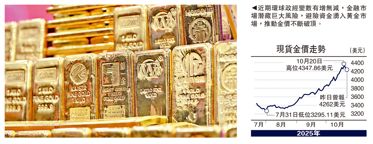 市場憧憬美國繼續減息,支持美股以至環球股市在歷史高位徘徊,但作為避險資產的黃金價格卻不斷破頂,升上4300美元水平,黃金市場呈現狂升狀態,反映投資者對環球市場有很大戒心,紛紛加碼買保險,即增持黃金,對沖美元、美股及美債大冧以及金融危機爆發的風險。事實上,近期環球政經變數有增無減,金融市場潛藏巨大風險,其中美歐日債同步下跌,已敲響了重要警號,隨時演變成為一場債務風暴,投資者不宜掉以輕心。