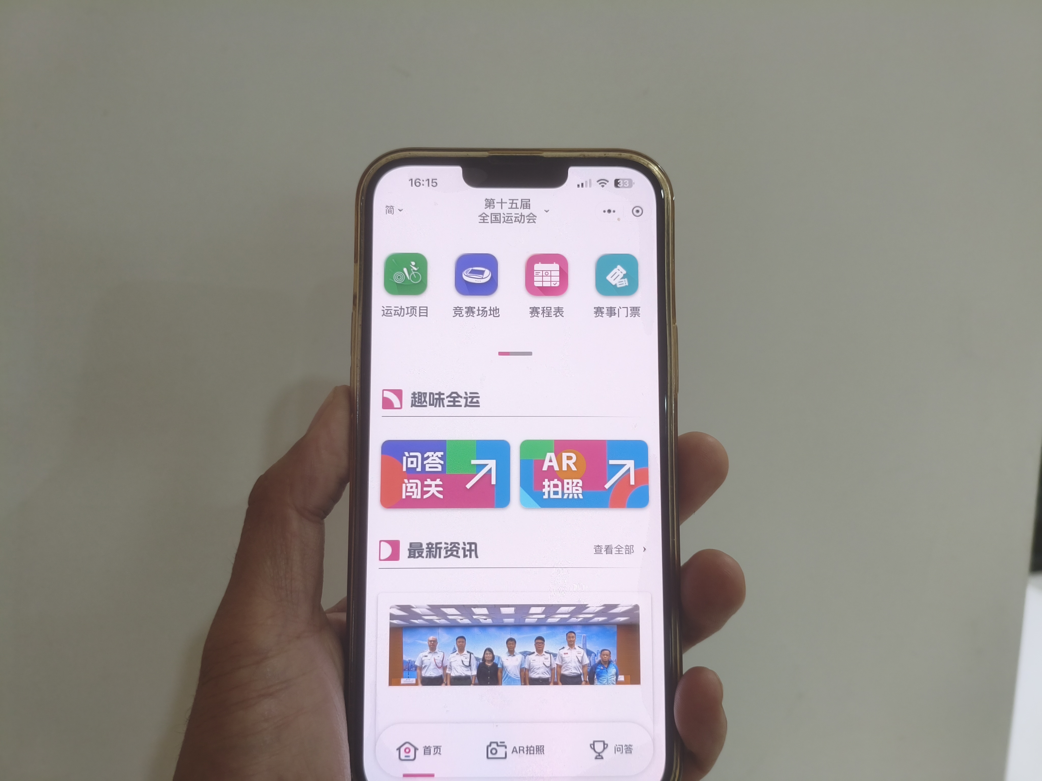 記者點擊「全運香港」發現,除了有香港賽區的賽事服務,還有一些特色體驗項目,比如在「趣味全運」環節,「問答闖關」提供全運知識問答遊戲,「AR拍照」則可通過拍攝人物照或風景照,生成有全運會標籤的個人專屬明信片,並且通過掃碼可以打印。