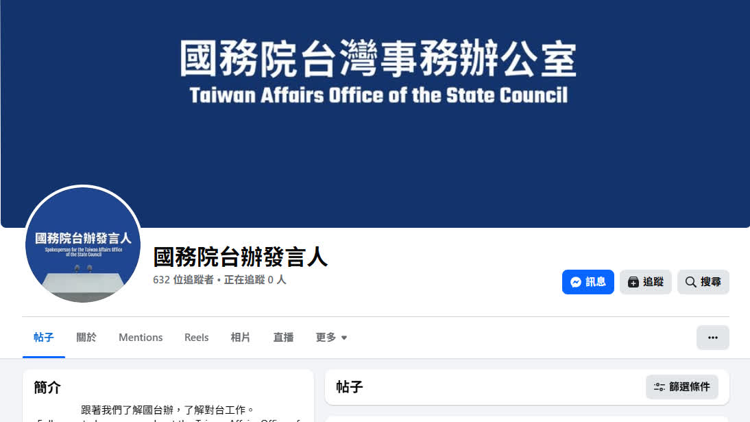 據了解,「國務院台辦發言人」FB賬號以繁體中文發布內容,賬號簡介以中英文寫到「跟着我們了解國台辦,了解對台工作」。