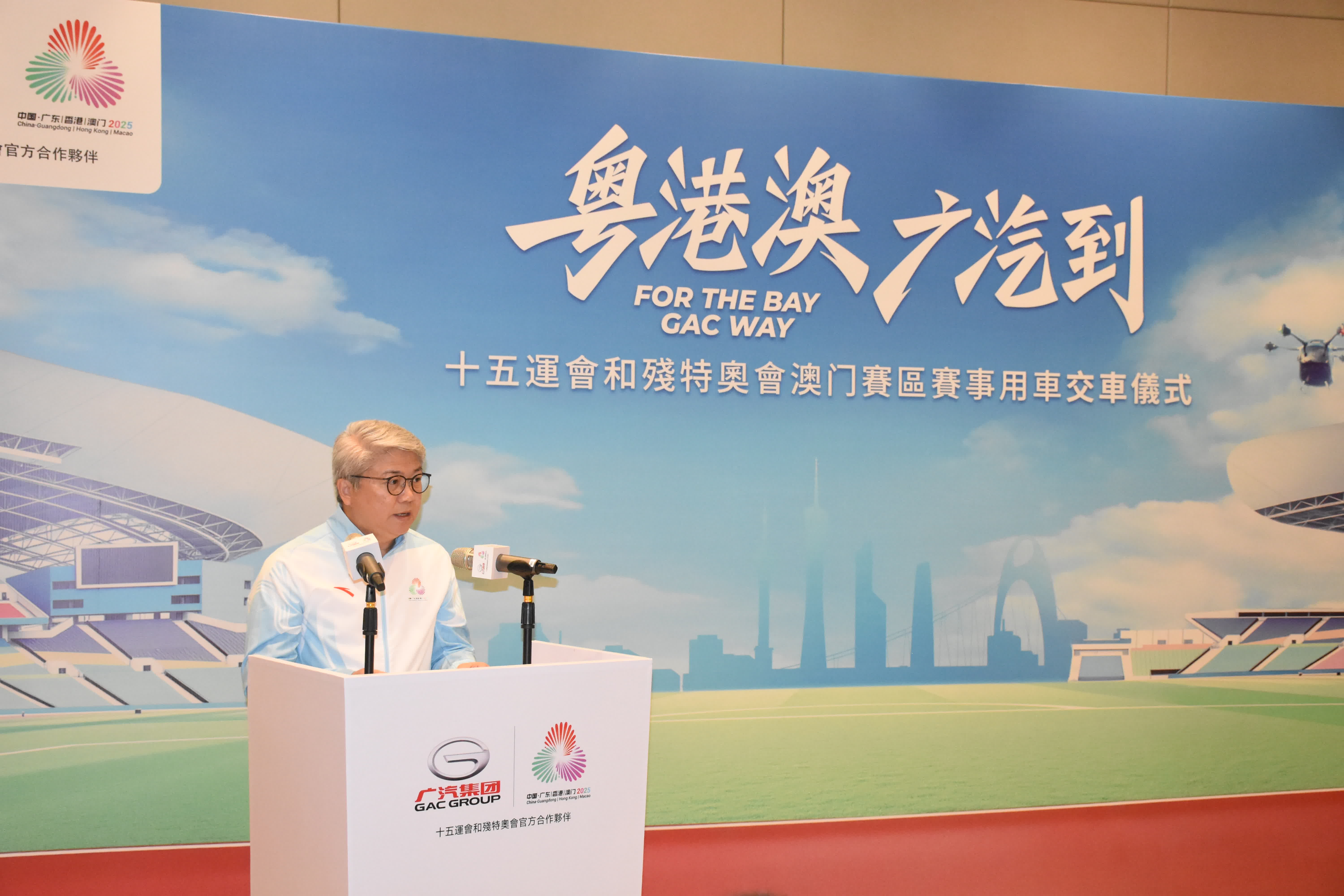 澳門賽區賽事用車交付儀式今(22)日在澳門東亞運動會體育館舉行。十五運會及殘特奧會澳門賽區籌備辦公室主任潘永權、副主任傅斯娜,廣汽國際副總經理王順勝、廣汽國際澳門經銷商代表宏益集團執行董事鄭穎堯等出席交車儀式。