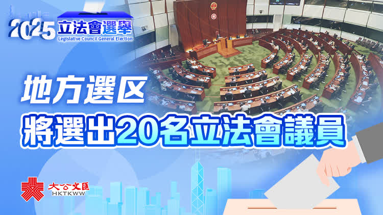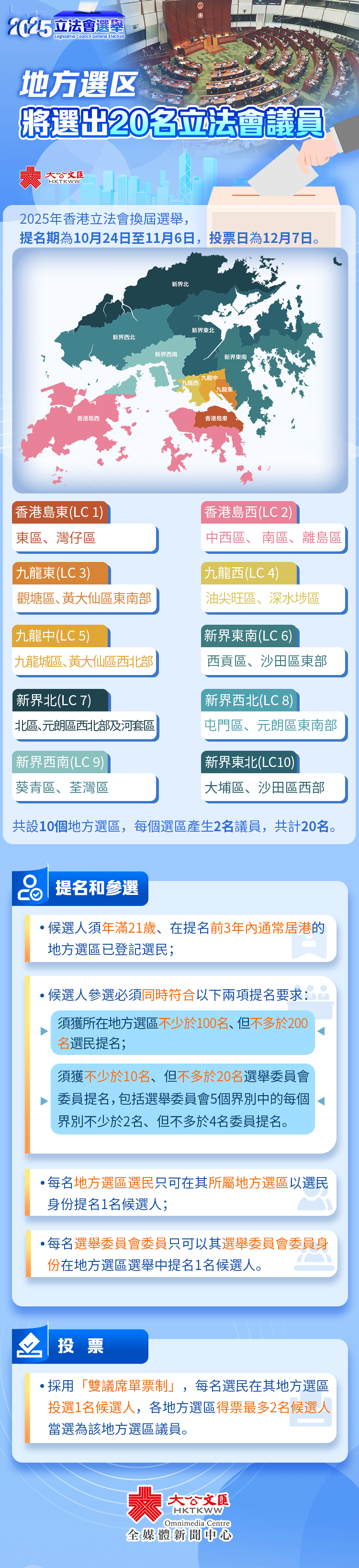 2025年立法會換屆選舉提名期將從本周五(10月24日)開始,至11月6日截止,並將於12月7日進行投票選舉。立法會的90名議員將會通過三種方式選舉產生,包括40席選舉委員會選舉的議員、30席功能界別選舉的議員及20席地方選區直接選舉的議員。屆時,將從10個地方選區選出20名立法會議員,也就是每個地方選區選出2名議員。
