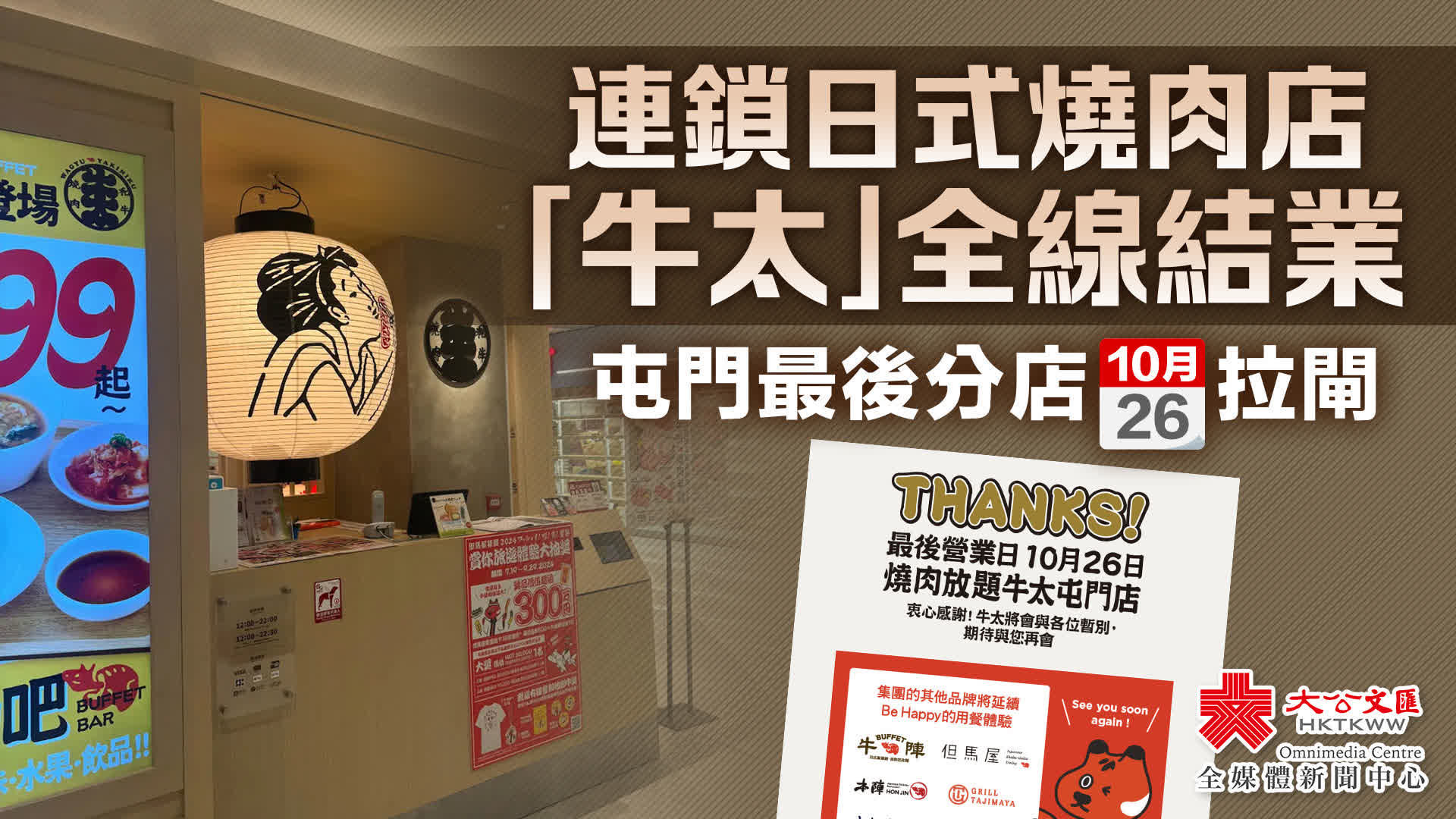 大公文匯全媒體報道,連鎖日式燒肉店「牛太」在相繼結束馬鞍山與沙田分店後,最後一間位於屯門的分店也將於10月26日停業。「牛太」日前在社媒公布結業消息,表示因應營運策略調整,屯門分店將於10月26日(周日)結束營業,並感謝顧客一直以來的支持。