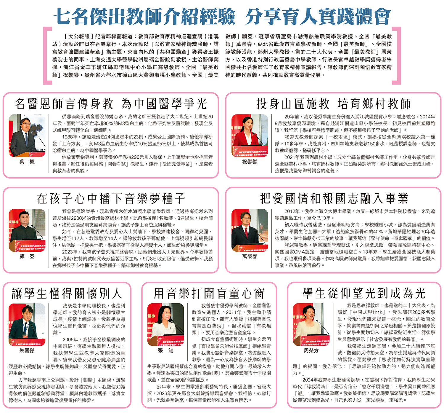 【大公報訊】記者邱梓茵報道:教育部教育家精神巡迴宣講(港澳站)活動於昨日在香港舉行。本次活動以「以教育家精神鑄魂強師,譜寫教育強國建設華章」為主題,來自內地的「共和國勳章」獲得者王振義院士的同事、上海交通大學醫學院附屬瑞金醫院副教授、主治醫師葉楓,浙江省金華市浦江縣鄭宅鎮中心小學正高級教師、全國「最美教師」祝響響,貴州省六盤水市鐘山區大灣鎮海嘎小學教師、全國「最美教師」顧亞,遼寧省葫蘆島市渤海船舶職業學院教授、全國「最美教師」萬榮春,湖北省武漢市盲童學校教師、全國「最美教師」、全國模範教師張龍,鄭州大學教授、黨的二十大代表、全國「最美教師」周榮方,以及香港特別行政區香島中學教師、行政長官卓越教學獎獲得者朱國傑共七名教師作了教育家精神宣講報告,讓教師們深刻領悟教育家精神的時代意義,共同推動教育高質量發展。