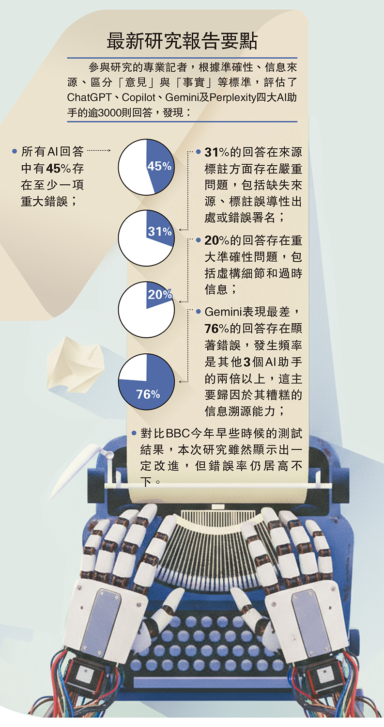 大公報綜合報道,歐洲廣播聯盟(EBU)22日公布的最新研究發現,目前歐美市場上4款主流人工智能(AI)助手在回答有關新聞事件的問題時,錯誤率接近一半。這些錯誤包括援引錯誤來源、混淆新聞事實與諷刺內容,甚至憑空捏造事件。研究人員提醒民眾,現階段AI助手還不是獲取新聞的可靠渠道,同時敦促相關企業承擔相應責任予以改進。EBU稱,隨着人們越來越多地使用AI搜索新聞,公眾對新聞的信任可能因此受到損害。