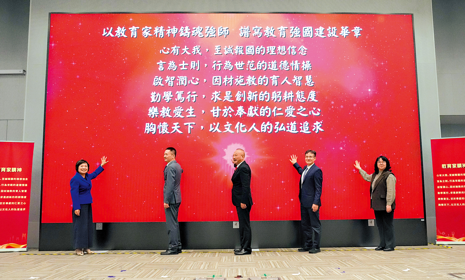 國家教育部教師工作司司長俞偉躍、國務院港澳事務辦公室四局局長陳偉、中央人民政府駐香港特別行政區聯絡辦公室教育科技部部長王偉明、香港特區政府教育局局長蔡若蓮、澳門教育及青年發展局副局長阮佩賢一同主持宣講會啟動儀式。