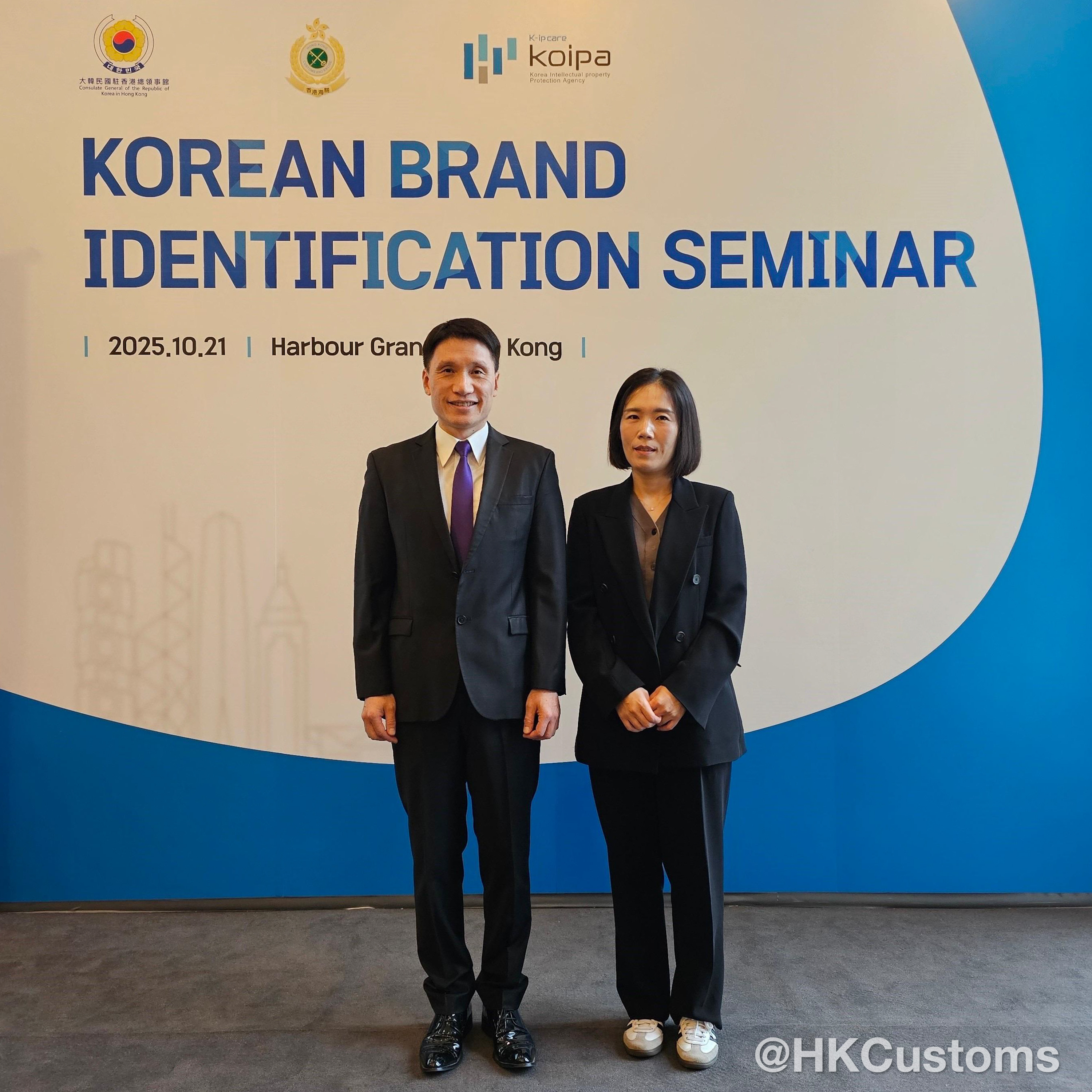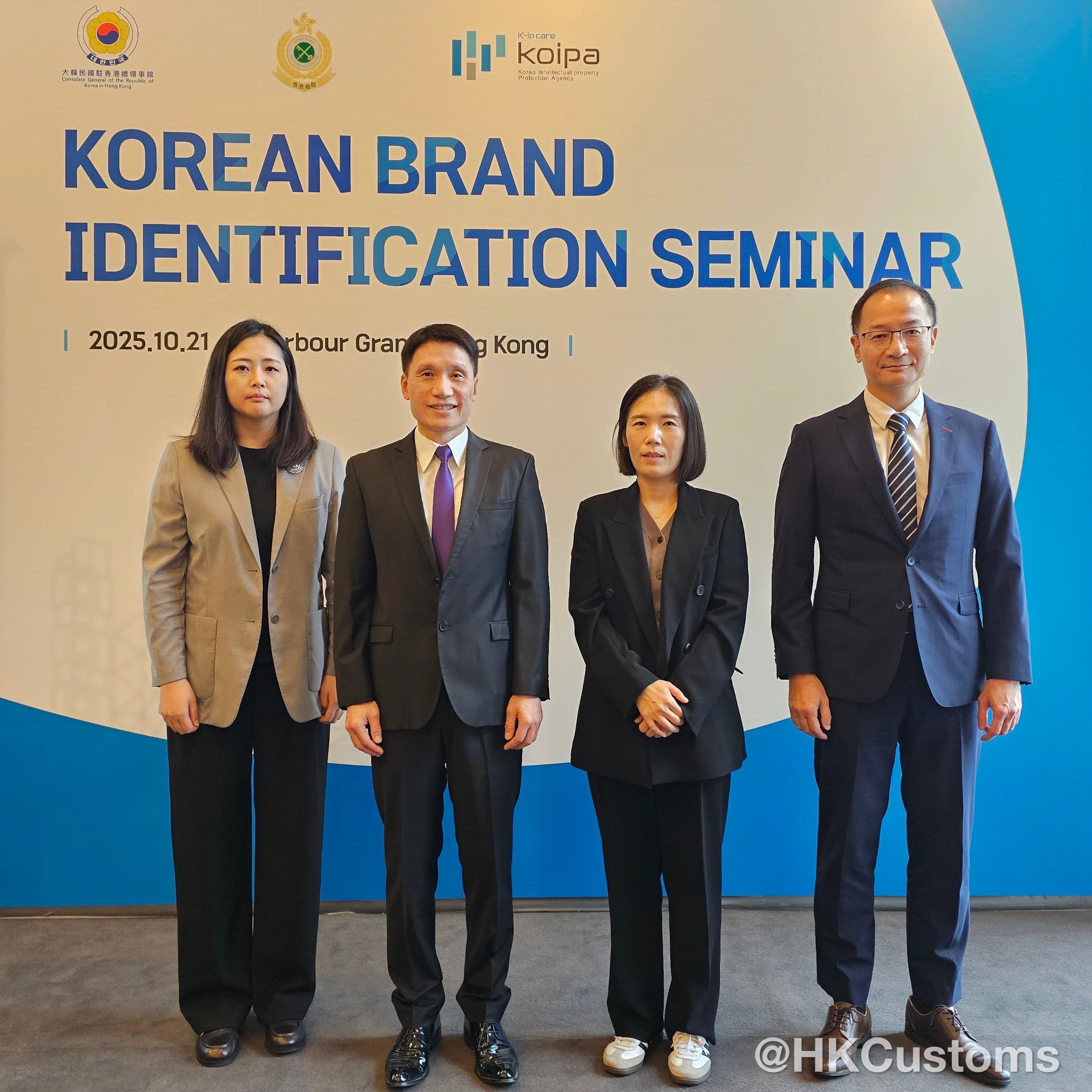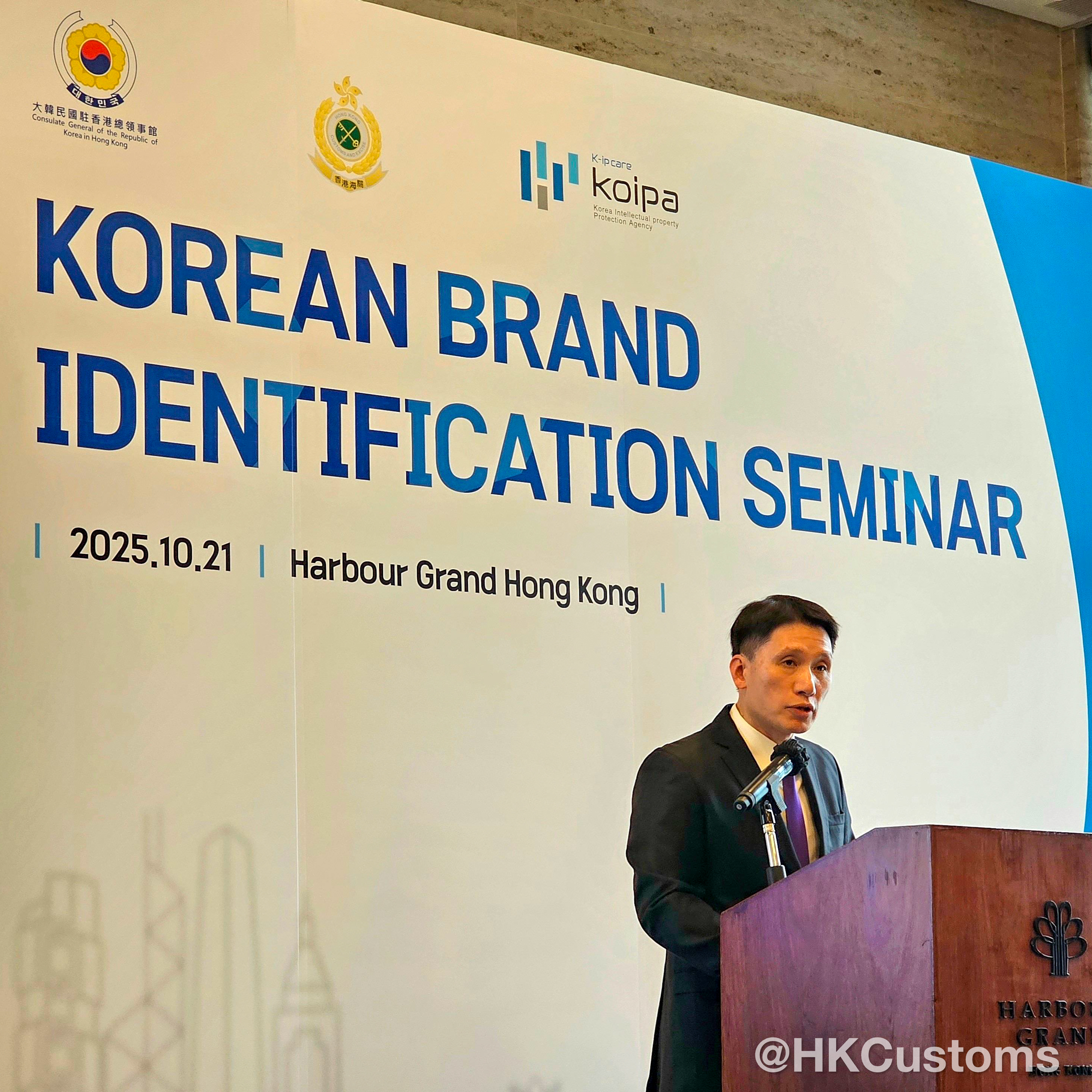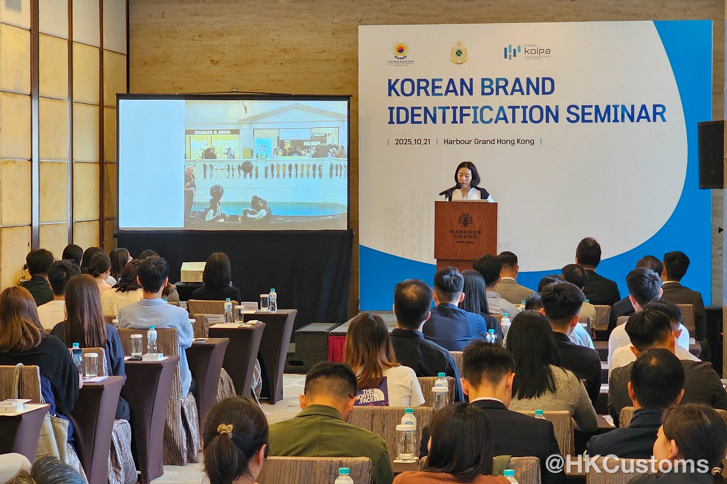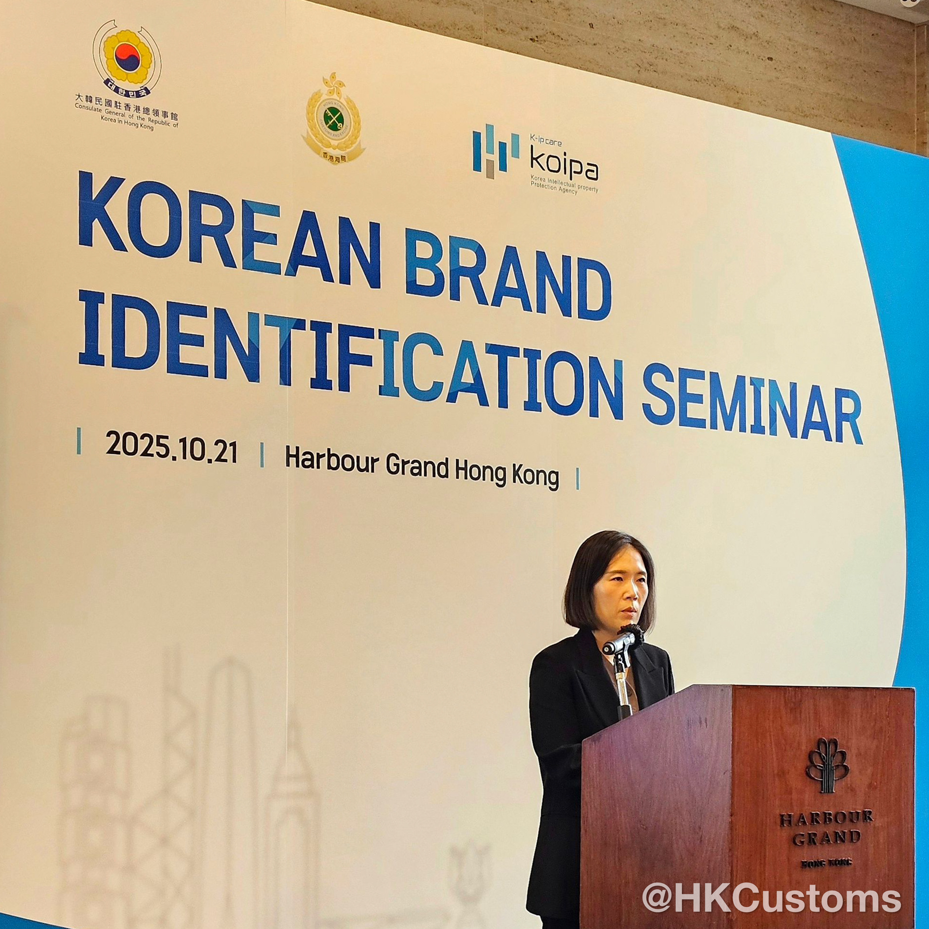 香港海關、韓國駐香港總領事館與韓國知識產權保護院於十月二十一日聯合舉辦了一場韓國品牌鑑證研討會。在研討會上,四個知名韓國品牌代表親臨香港,向超過50名來自調查科及口岸科的海關人員詳細介紹產品,並進行現場鑑證示範,提升海關人員辨別產品真偽的技巧,加強其打擊侵權行為的能力。