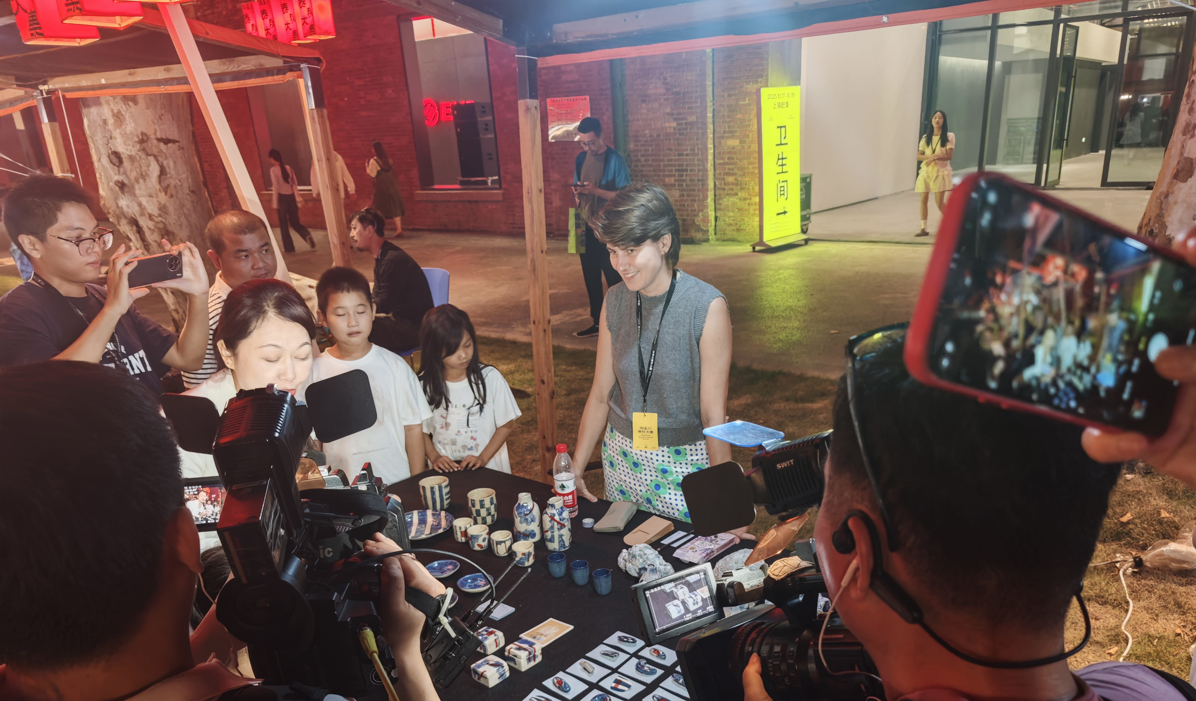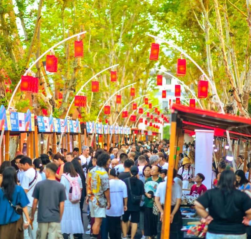 昏黃燈光下,隨風飛舞的泡泡,金黃稻桿搭建的攤位,落下的花瓣雨;瓷器、肥皂、精油等各式精緻手作琳琅滿目,交織多元風情,創作巧思不斷擴展人們的視野邊界;攤位前人潮湧動,外國藝術家無比愜意,甚至和中國遊客比劃手勢以交流;萬窯廣場點火,踏歌行巡遊、行進式互動快閃,全城陷入沉浸式狂歡……