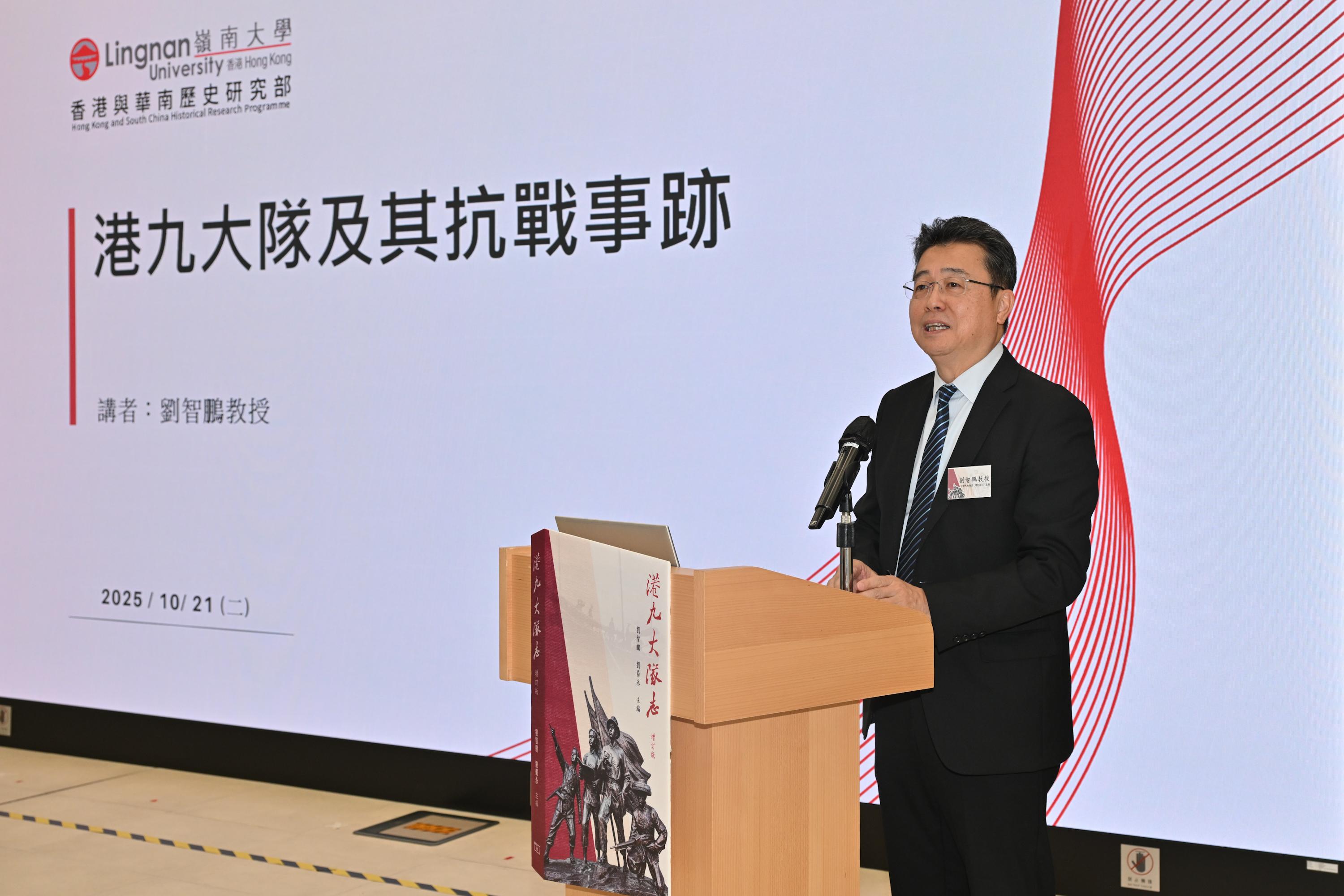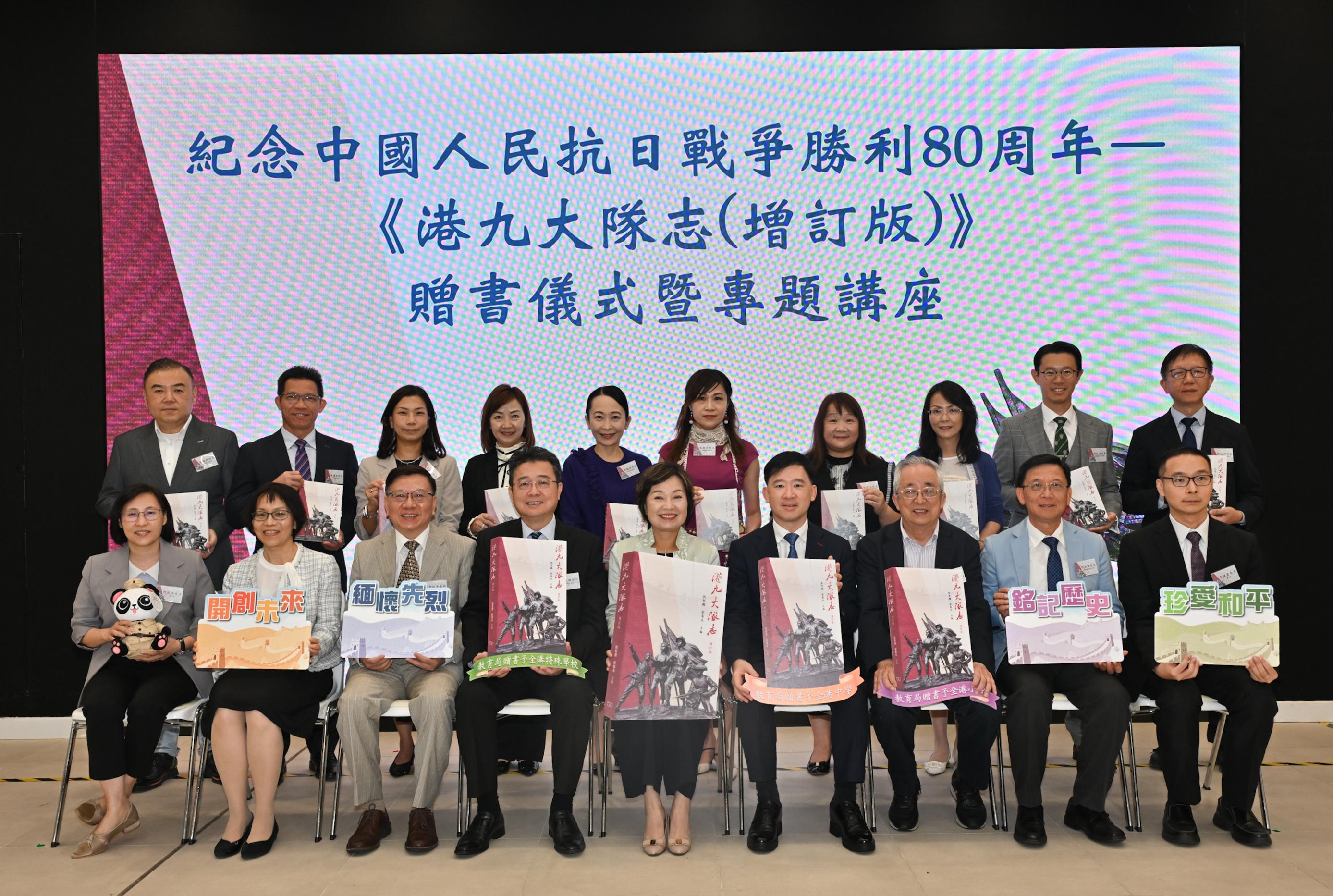 教育局周二(十月二十一日)舉行紀念中國人民抗日戰爭勝利80周年──《港九大隊志(增訂版)》贈書儀式暨專題講座,由教育局局長蔡若蓮博士將《港九大隊志(增訂版)》贈予學校議會及校長會代表,以豐富教授抗日戰爭的相關內容,提升學與教成效。