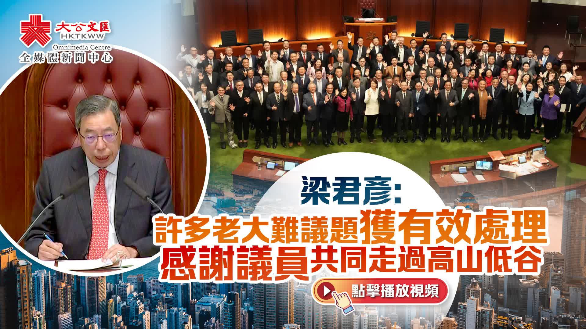 (大公文匯全媒體 記者 王俊傑)今日(23日)是立法會大會最後一日,立法會主席梁君彥有感而言,稱自己從2004年第三屆立法會當選立法會議員,至今工作21年,過去9年更加有幸擔任主席,與大家一起走過高山低谷,經歷順流逆流,同時感謝議員支持他成為完善特區選舉制度後的首屆立法會主席。