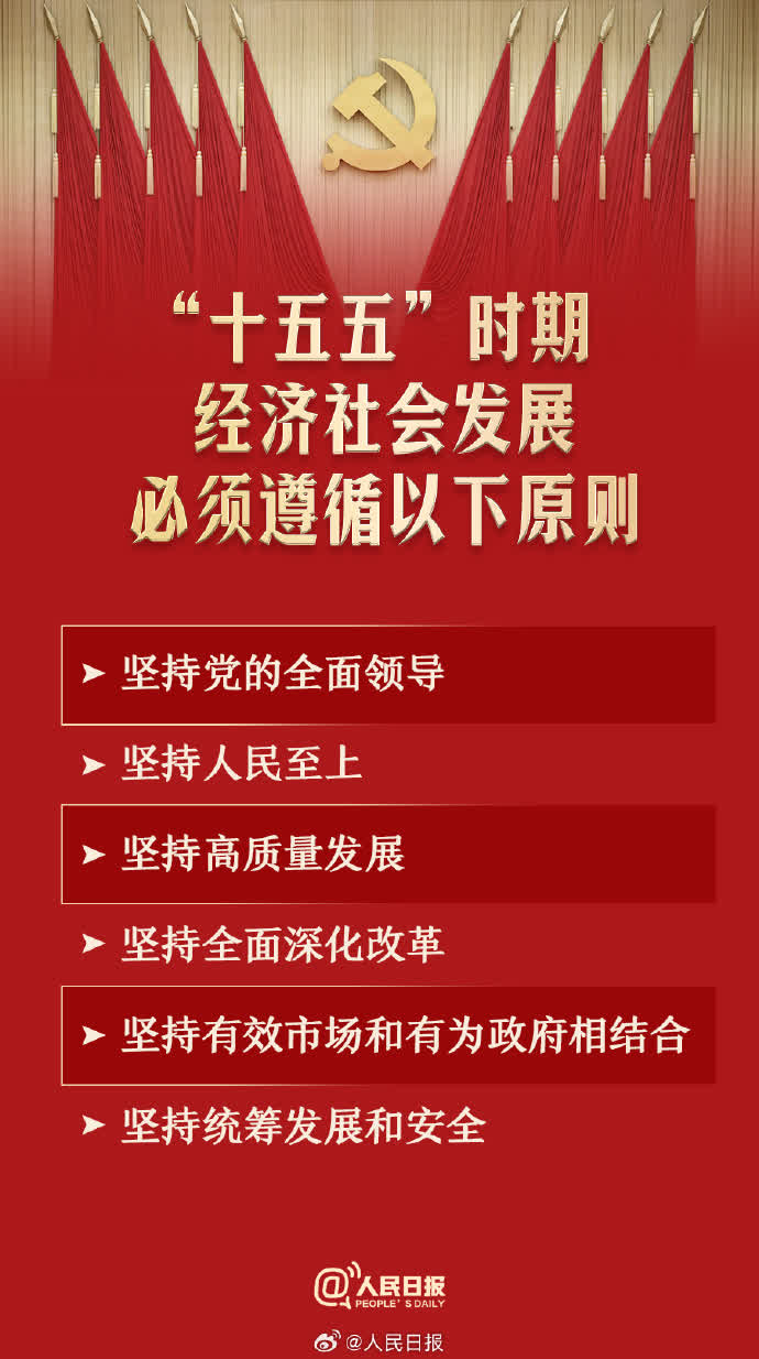 全會指出,「十五五」時期經濟社會發展必須遵循以下原則,堅持黨的全面領導,堅持人民至上,堅持高質量發展,堅持全面深化改革,堅持有效市場和有為政府相結合,堅持統籌發展和安全。