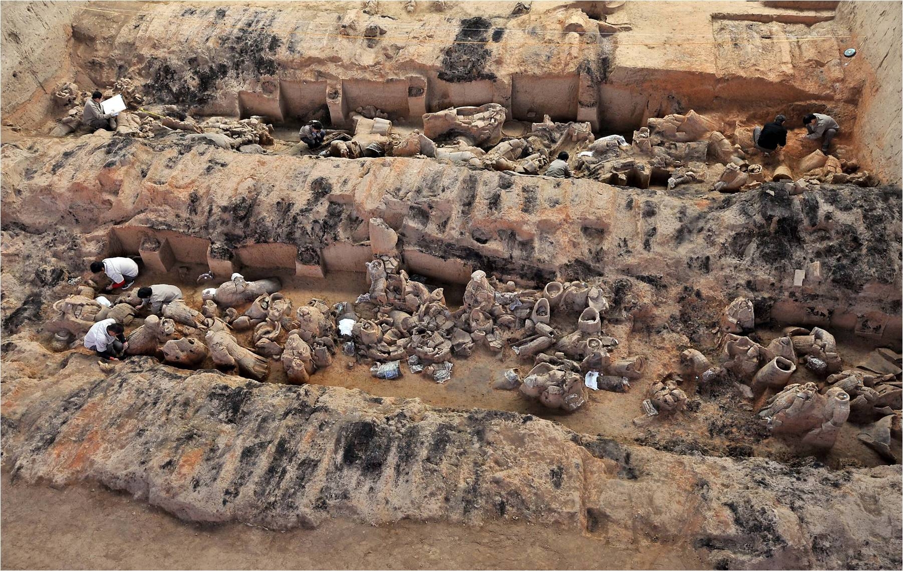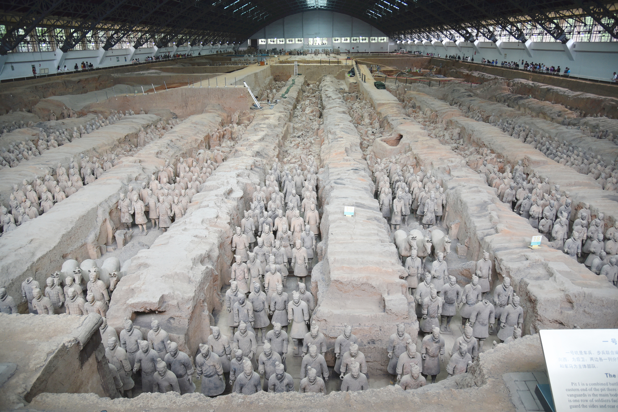 秦始皇帝陵位於陝西西安臨潼,1974年3月,當地村民在打井時意外發現破碎陶俑,讓秦兵馬俑「重見天日」。半個世紀來,考古工作者相繼發現了秦兵馬俑一、二、三號坑,總面積超過2萬平方米,發掘出土與真人真馬一般大小的陶俑、陶馬2000多件,以及銅車馬、石甲胄、百戲俑等重要文物。