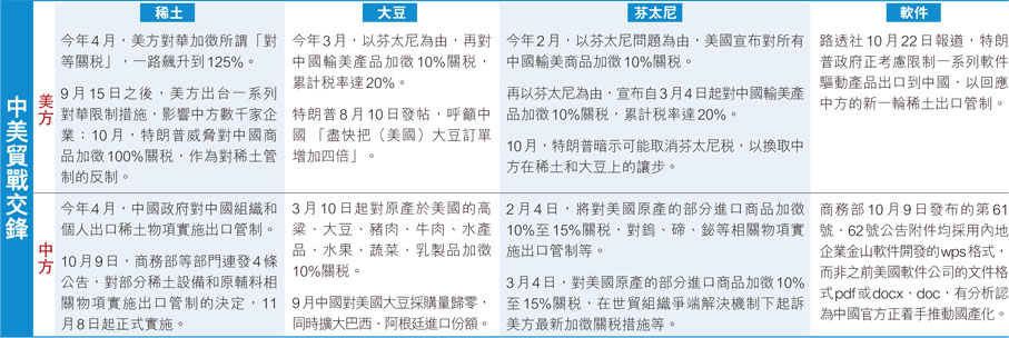 近段時間以來,中美貿易戰漸有升溫態勢。商務部發言人此前指出,9月中美馬德里經貿會談以來,短短20多天時間,美方持續新增出台一系列對華限制措施。在此背景下,中國商務部等多部門聯動,於10月9日連發6份公告,其中4份涉及美方關注的重點之一稀土:宣布對稀土物項、稀土技術、稀土設備、中重稀土、鋰電池原材料等實施出口管制。這是中國政府依據法律法規,完善自身出口管制體系的正常行為。此外,為反制美國10月14日開始向中國船隻徵收港口服務費,國家交通運輸部宣布,亦於10月14日起對美國船舶收取特別港務費。