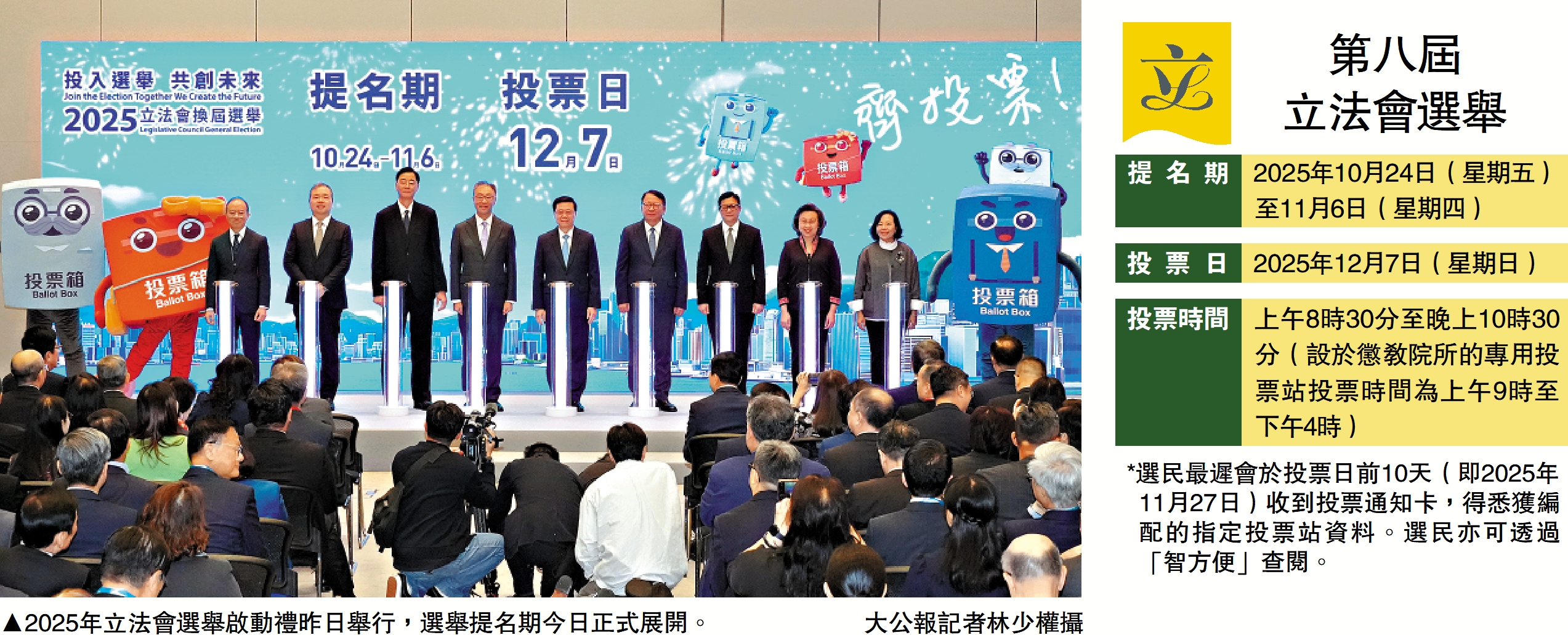 (大公報 記者 李慧妍)香港特別行政區第八屆立法會選舉投票將於12月7日舉行,提名期今日展開。