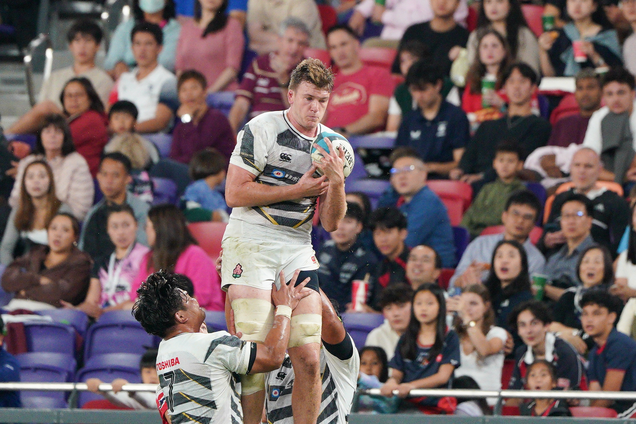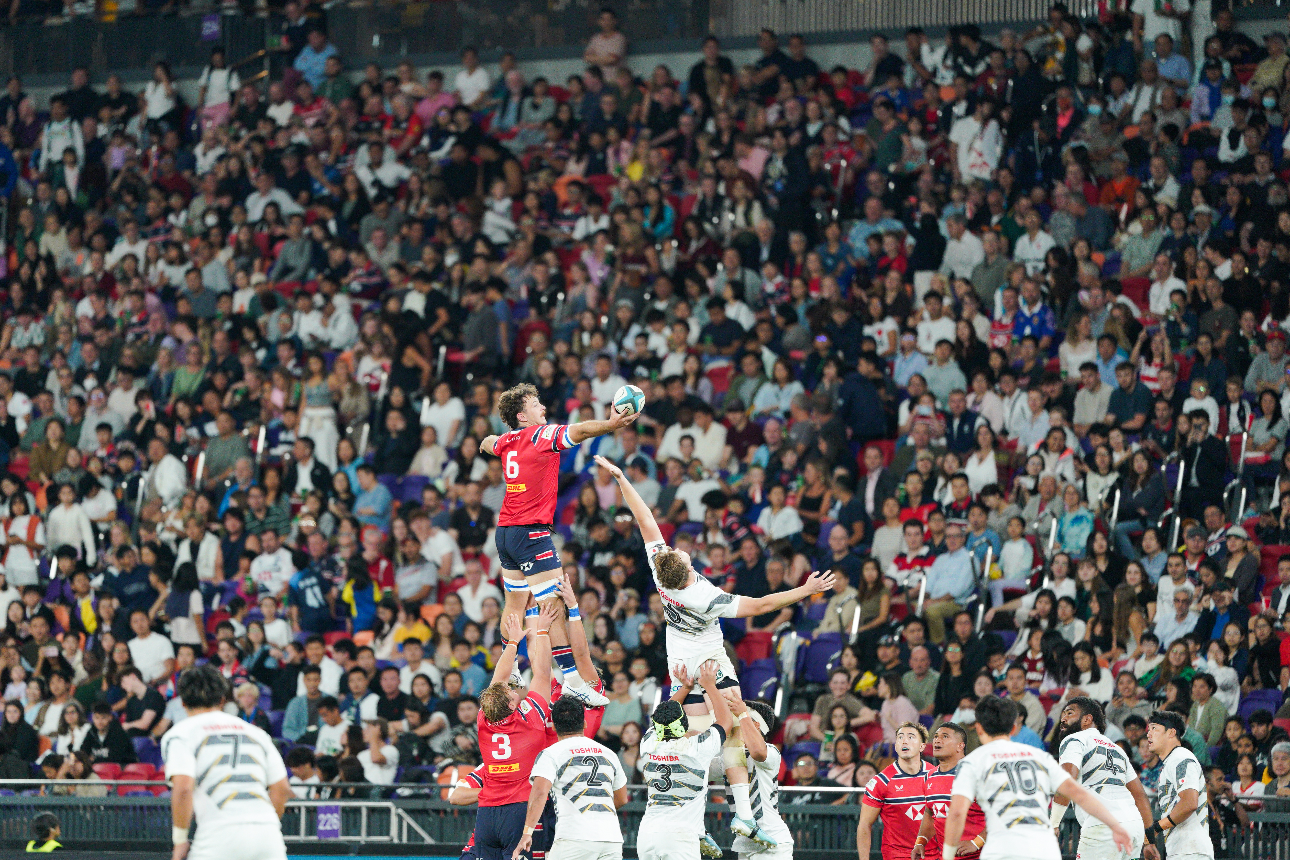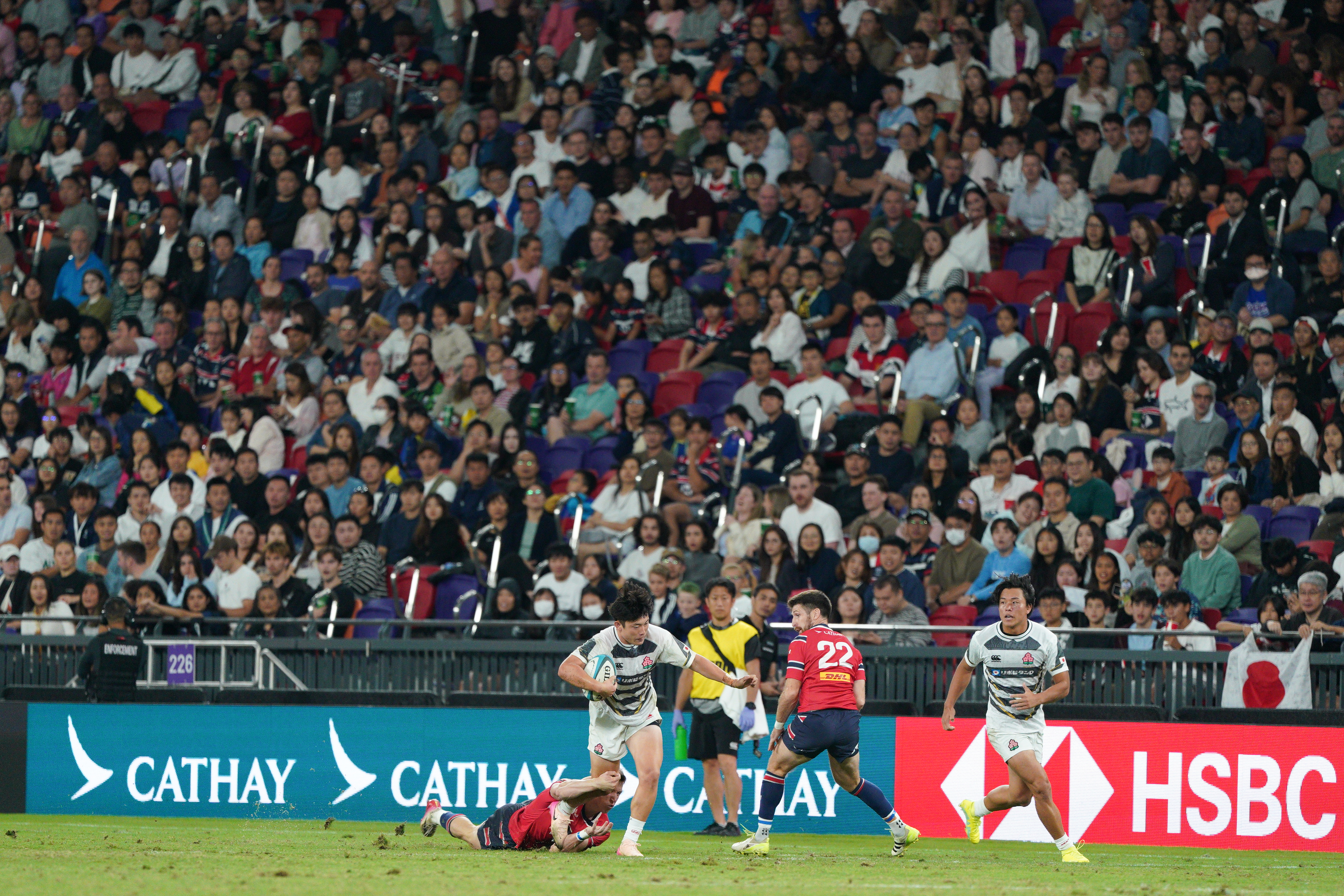 大公文匯全媒體報道,中國香港男子十五人欖球代表隊今晚(24日)在啟德主場館迎戰亞洲強敵日本隊,雖全場奮力拚搏兩度達陣,仍在現場觀眾的見證下以14比59告負。現場氣氛熱烈,共有約7702名球迷湧入場館,見證這場國際賽事對決。