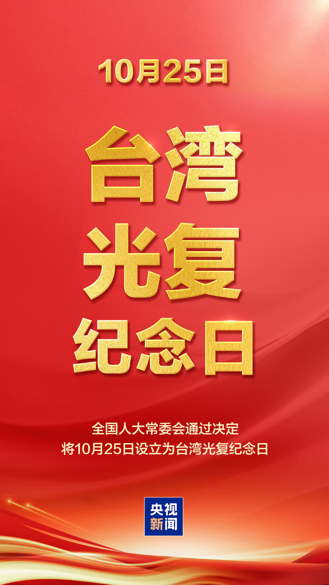 據央視新聞報道,國務院台辦發言人陳斌華24日表示,全國人大常委會今天根據憲法作出決定,以法律形式將10月25日設立為台灣光復紀念日,並規定國家通過多種形式舉行紀念活動。最高國家權力機關常設機關這一莊嚴決定,集中反映了包括台灣同胞在內的全體中華兒女的共同心愿和集體意志,是捍衛台灣光復、回歸祖國這一重要史實和民族榮光的有力舉措。