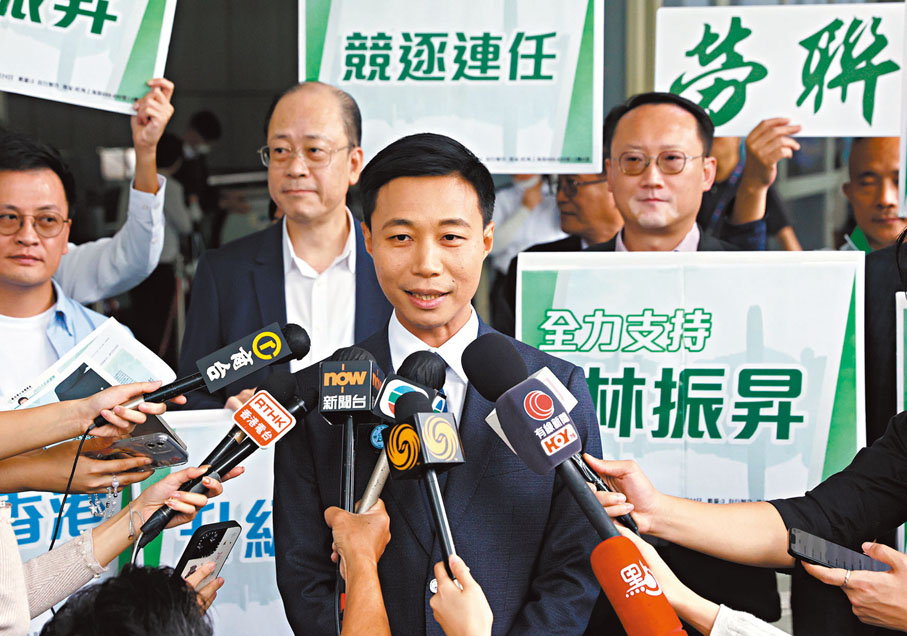 林振昇亦報名參選競逐連任,多位勞聯代表到場支持。他表示,至今取得19名選委提名,會繼續向不同界別的選委宣傳政綱,一旦當選將致力深化香港和大灣區內地城市的關係,推動灣區標準、人才流動等。