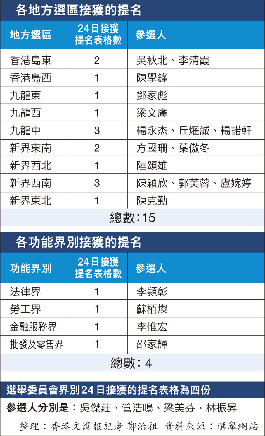 (香港文匯報 記者 洪澤楷、康敬、鄭治祖)第八屆立法會選舉提名首天,選舉委員會界別共接獲4份提名表格,4名參選人吳傑莊、管浩鳴、梁美芬、林振昇全部競逐連任。他們昨日見傳媒時分享自己的優勢和參選政綱,認為自己可以利用自己的專業背景和多年的社會服務經驗繼續為立法會工作作出貢獻。面對競爭,他們表示歡迎,並相信自己的競爭對手都有服務社會的心,又希望更多有識之士、有心之人參與選舉。