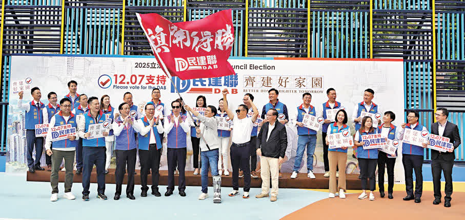 其後,盧文端、譚耀宗、葉國謙、彭長緯、簡志豪共同向民建聯參選人授旗,預祝「旗開得勝」、取得佳績,並再次呼籲選民在12月7日踴躍投票。