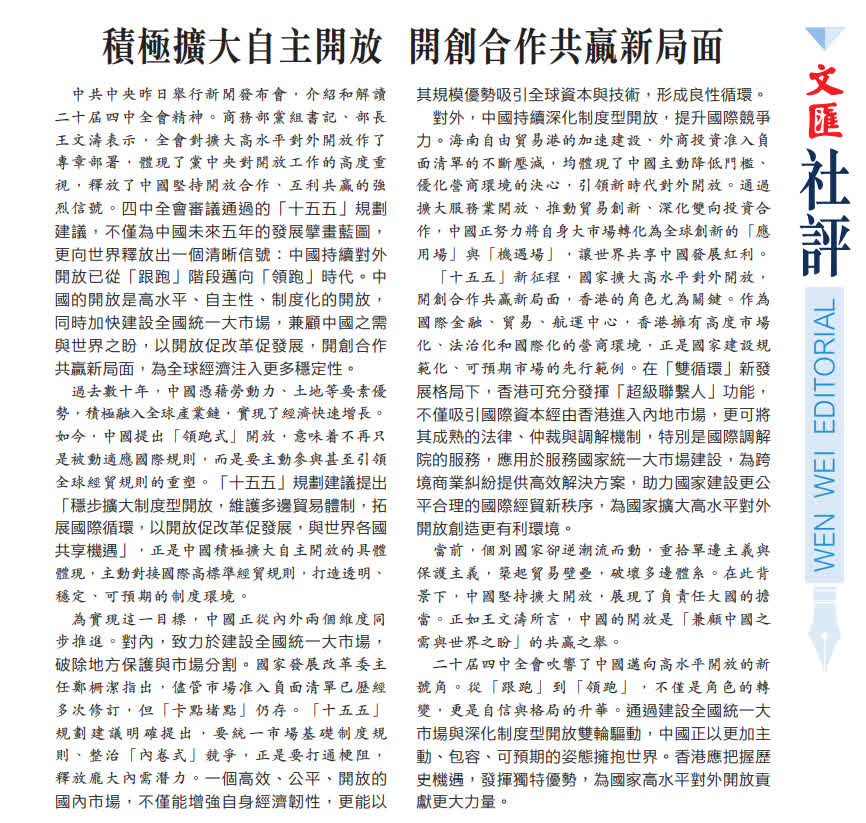 中共中央昨日舉行新聞發布會,介紹和解讀二十屆四中全會精神。商務部黨組書記、部長王文濤表示,全會對擴大高水平對外開放作了專章部署,體現了黨中央對開放工作的高度重視,釋放了中國堅持開放合作、互利共贏的強烈信號。四中全會審議通過的「十五五」規劃建議,不僅為中國未來五年的發展擘畫藍圖,更向世界釋放出一個清晰信號:中國持續對外開放已從「跟跑」階段邁向「領跑」時代。中國的開放是高水平、自主性、制度化的開放,同時加快建設全國統一大市場,兼顧中國之需與世界之盼,以開放促改革促發展,開創合作共贏新局面,為全球經濟注入更多穩定性。