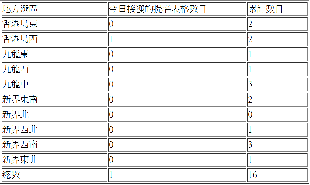 各地方選區接獲的提名表格數目如下: