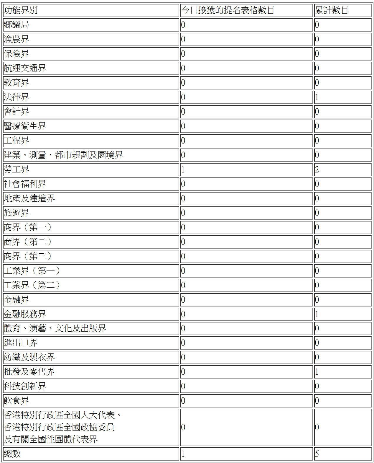 各功能界別接獲的提名表格數目如下: