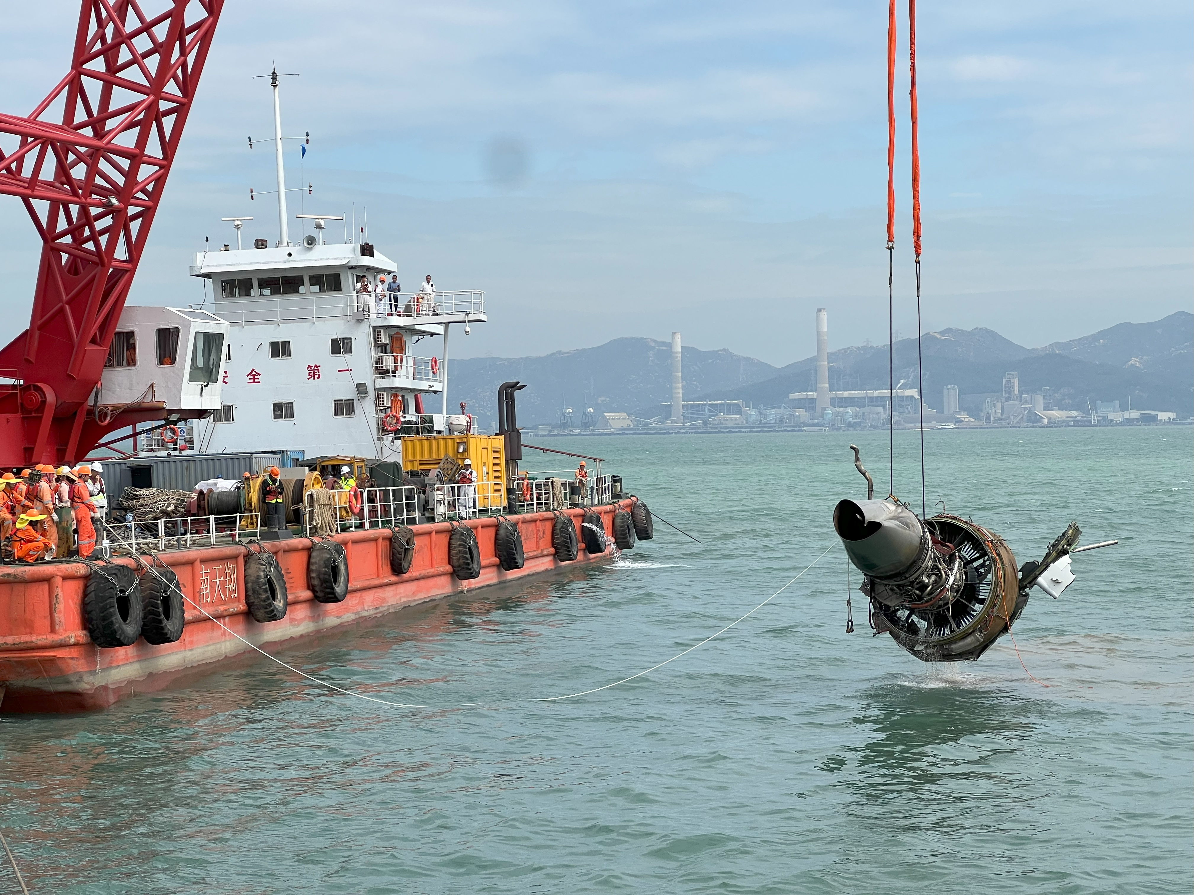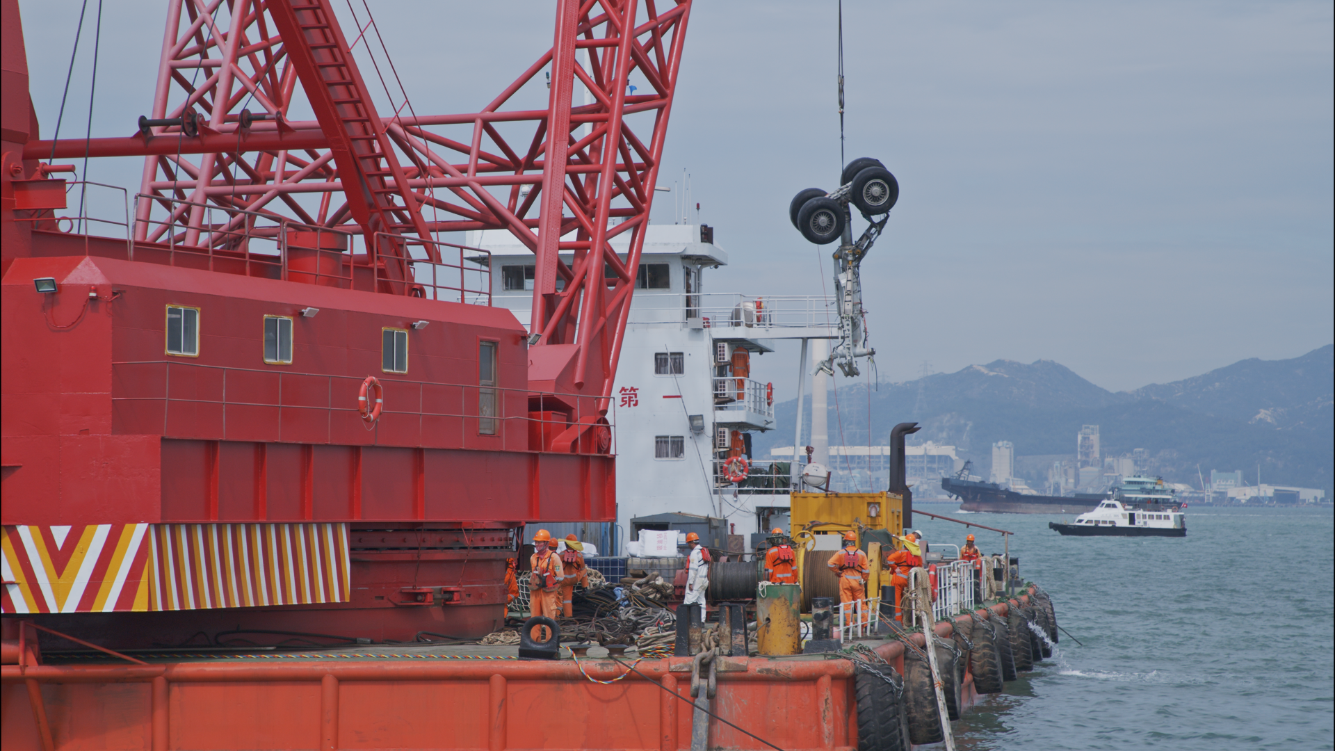 今日早上約9時,打撈團隊的專業打撈船「南天翔」、「南天鵬」及拖船「穗救拖18」,再吊起貨機的部分機身殘骸放在躉船上。隨後工程人員用鋼索從四邊固定擱在跑道對出防波堤海中最大的一件殘骸,即貨機的機身連機頭部分。至下午約1時半開始,打撈船的吊機逐步緩慢的將整件殘骸吊起,可見左邊機翼逐漸離開水面。屬廣州打撈局的另一艘拖船「德鵬」,以及用作承載超大物件的半潛船「重任1500」亦遂步移近北跑道。