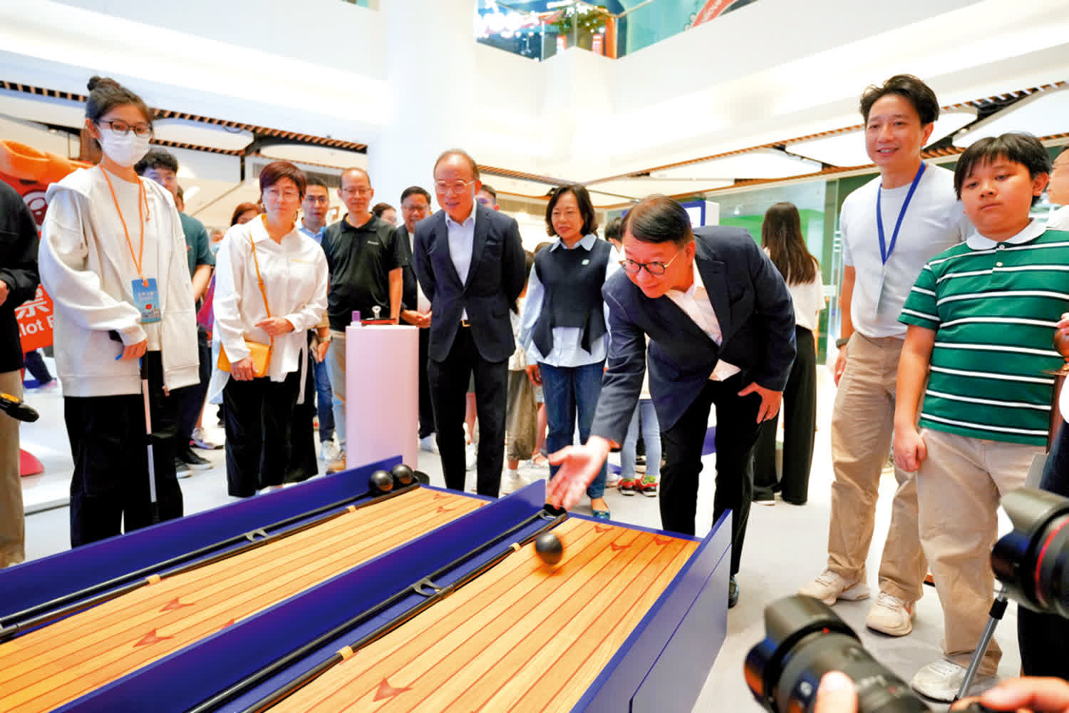 大公報記者逐一體驗遊戲,最吸睛的是名為「各投各位」的投球關卡:遊戲區仿照立法會議事廳,參加者先抽取不同顏色的「界別」卡,再把球投入相同顏色的洞口即算過關。輪到記者上場,一旁小朋友主動「教授」,指點投球角度與力度,圍觀者不時鼓掌加油,互動感滿分。