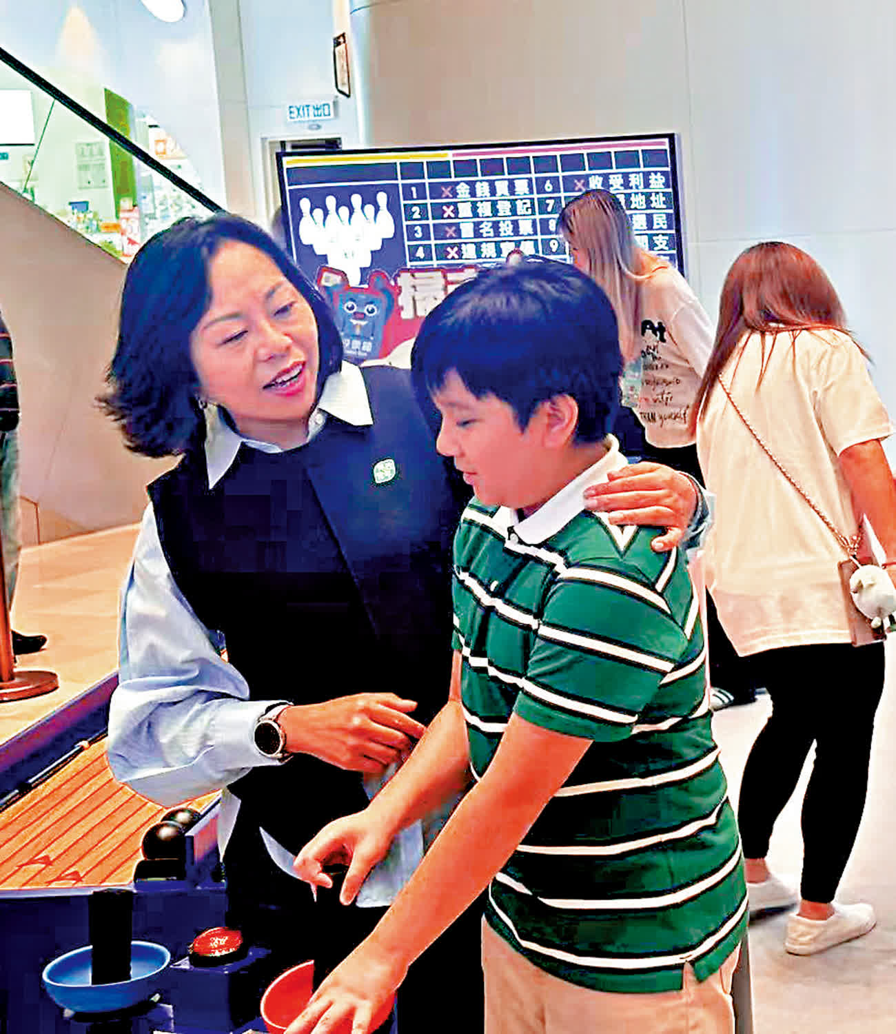 民政及青年事務局局長麥美娟來到展區中央,俯身與參與闖關遊戲的小朋友們打招呼。小朋友手握軟劍,在互動裝置前挑戰「選舉知識對對碰」,每翻開一格,驚呼聲與笑聲此起彼落。麥美娟指着展覽資訊板,耐心講解選舉小知識。其中一塊展板寫着「年滿18歲、香港永久性居民,先有資格投票」時,麥美娟提醒小朋友:「記得滿18歲都要登記做選民!」她又表示投票日為12月7日,是星期日,笑言「不用上學,要記得一早起身,就叫醒爸爸媽媽去投票。」