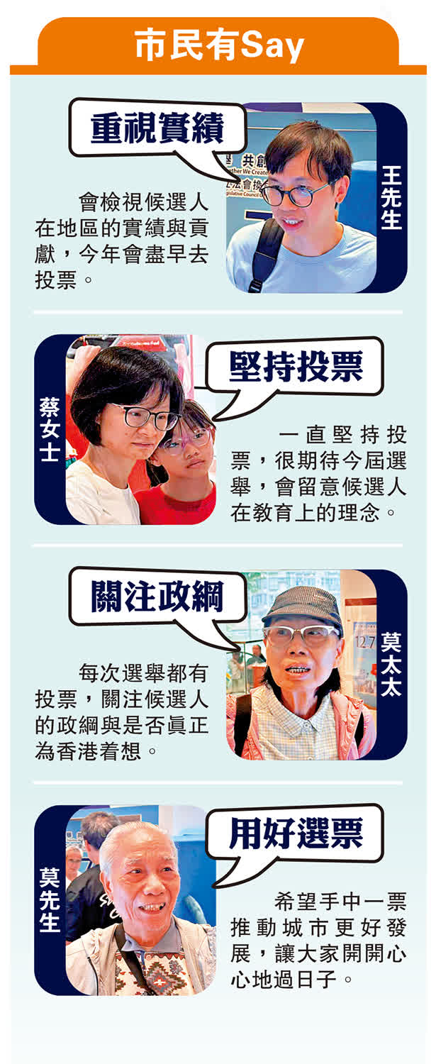 在旁觀戰的王先生直言最看重政綱,尤其是經濟對策,同時也會檢視候選人在地區的實績與貢獻,「今年會盡早去投票,選民的責任就是選嘛!」帶同女兒到場的蔡女士則表示,一直堅持投票,亦很期待今屆選舉。因家中有適齡學童,會更留意候選人在教育上的理念。