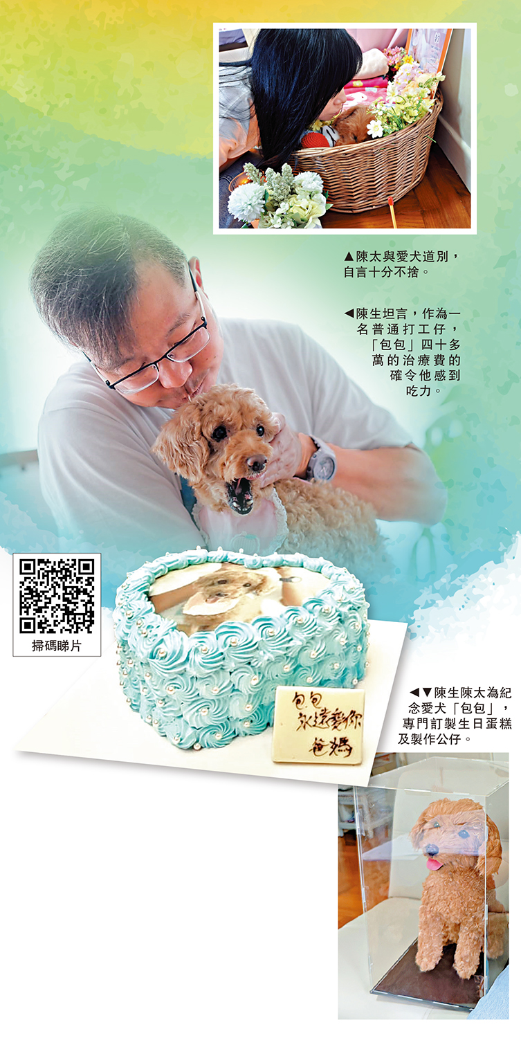 2024年9月,陳先生帶「包包」轉往其他診所求診,他指僅電療及相關治療便耗資22萬元,惟治療約一個月後,「包包」仍不敵癌病離世。一年間,為救治愛犬,他累計支出近40萬元。他指作為普通打工仔,這筆開銷讓他倍感吃力,但他含淚道:「牠(包包)就像我的女兒,哪怕醫生說22萬只能延長兩、三個星期的生命,我也願意盡全力。」陳先生感慨說,寵物癌症並非罕見,但動輒數十萬的治療費用,遠超出普通家庭承受能力。他期盼政府能更多關注有關情況,為有需要的寵物家庭提供幫助。