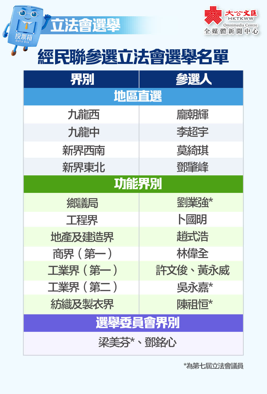 經民聯公布的參選名單顯示,梁君彥、盧偉國、林健鋒、龍漢標、陸瀚民5人棄選,4人競逐連任,分別是劉業強、吳永嘉、陳祖恒、梁美芬,他們均在原有界別競逐連任。