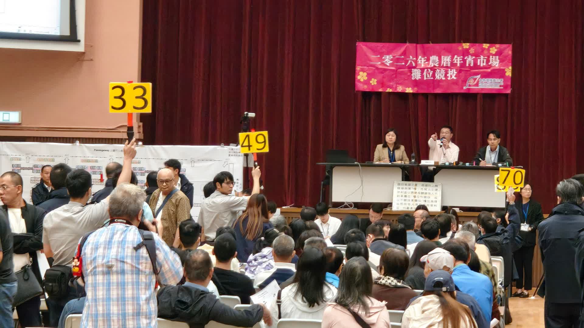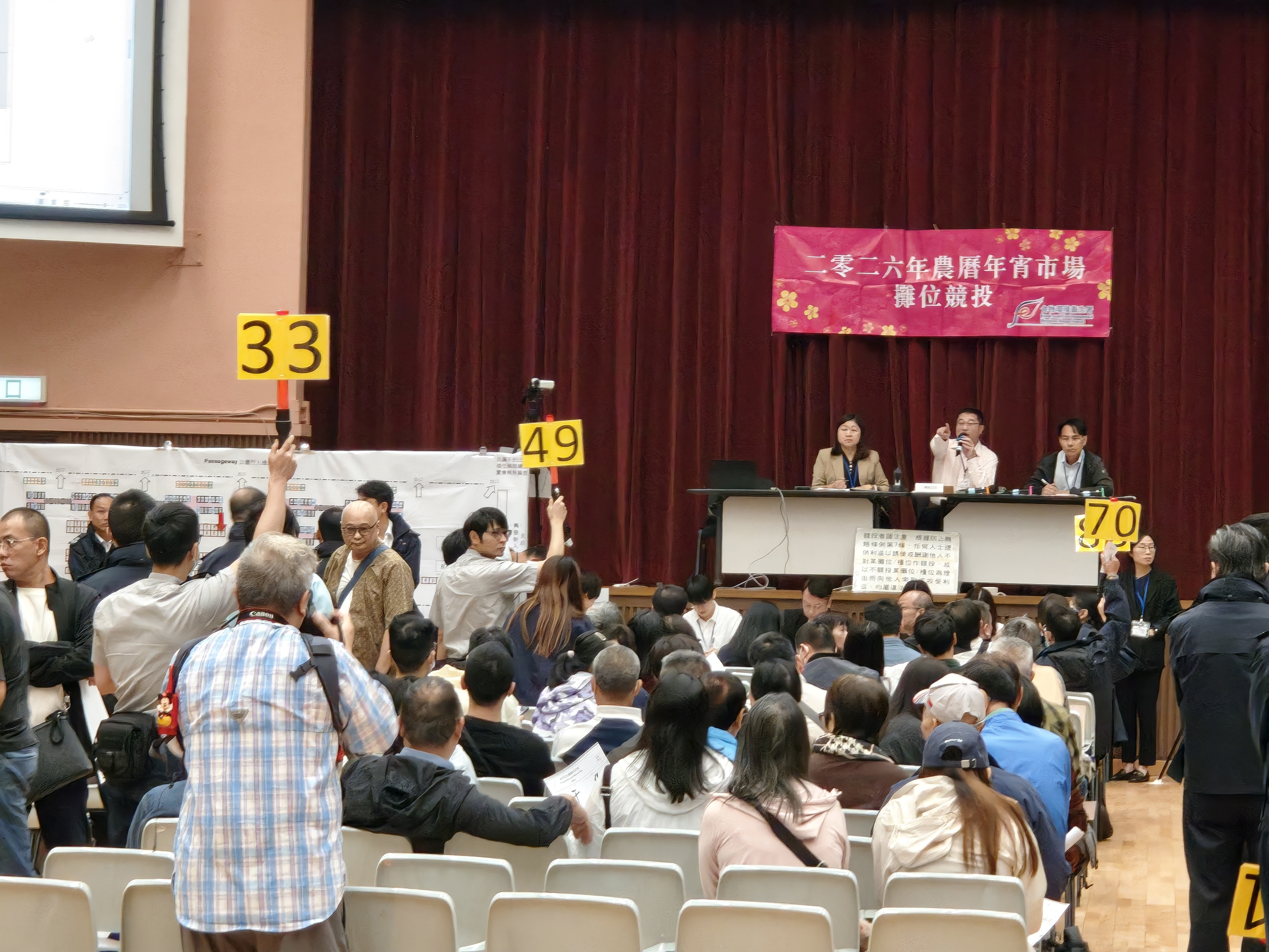 攤位競投分上午及下午兩個時段進行,上午時段由9時至中午12時30分,下午時段則由2時開始,直至競投結束為止。今日還會就濕貨攤位進行競投,第二日及第三日則將競投乾貨攤位。