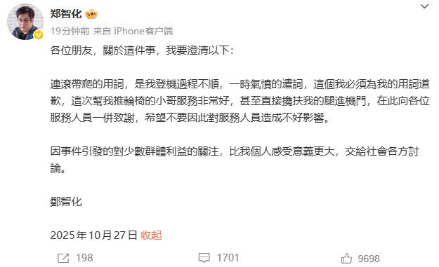 10月25日傍晚,深圳機場官方微博在鄭智化微博下評論稱,「尊敬的鄭先生,我們已關注到您反映的情況,對現場服務給您帶來的不便和困擾深表歉意。對於相關問題,我們已第一時間會同航空公司啟動核查。我們將以此為契機,全面審視並優化特殊旅客的服務保障細節,更好保障每一位旅客順暢出行。」