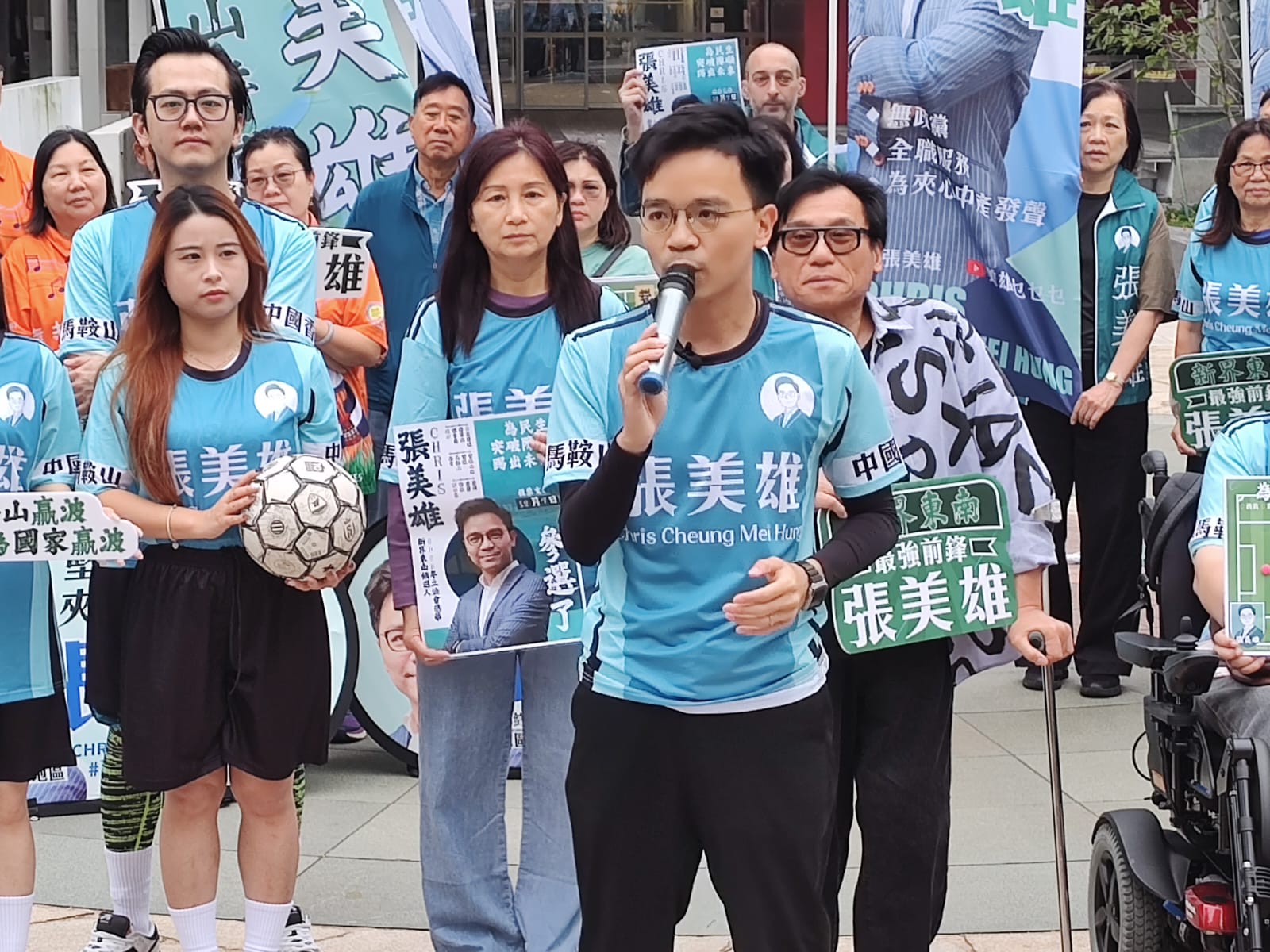 西貢區議員張美雄今早抵達將軍澳政府綜合大樓報名參選新界東南選區。他期望進入立法會這個更廣闊的「賽場」,協助政府推動民生議題,例如優化家庭友善政策、完善長者照顧體系、支持中年人轉型、助力中小企升級、推行全人教育等等。他續說,自己是「窮中產」、「平凡人」的代表,沒有大黨支持,亦欠缺雄厚資源,但他會以無黨派身份與市民並肩,像全速衝刺的足球前鋒,用盡每一分力為民生尋找「入球」機會。由於張美雄的從政道路源於其師傅方國珊,被問到會否影響對方的選情,張美雄強調,比賽第二,友誼第一,不會影響兩人的關係。